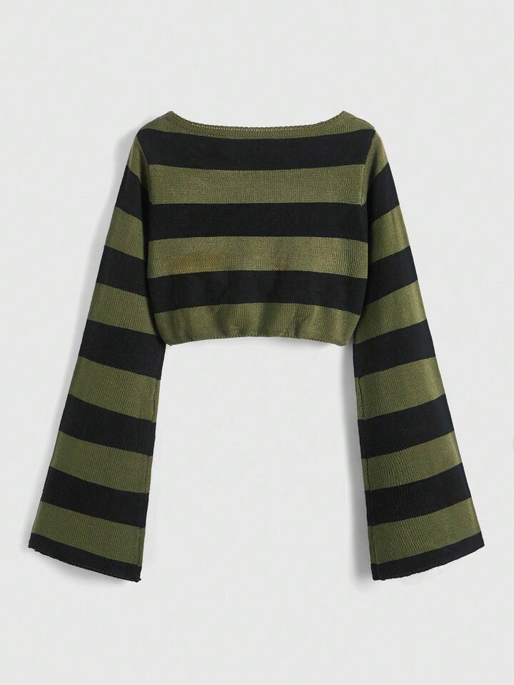 Kawaii Valentinstag Damen Pullover mit Herz-Ausschnitt, gestreiftem Glockenärmel