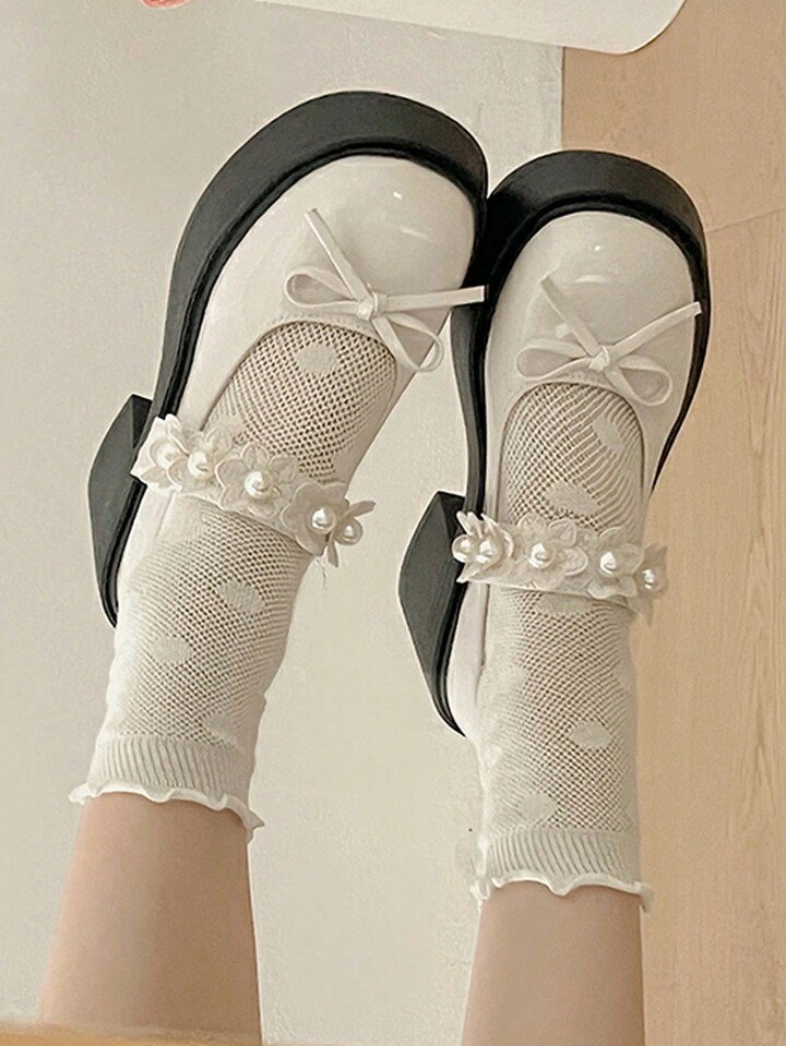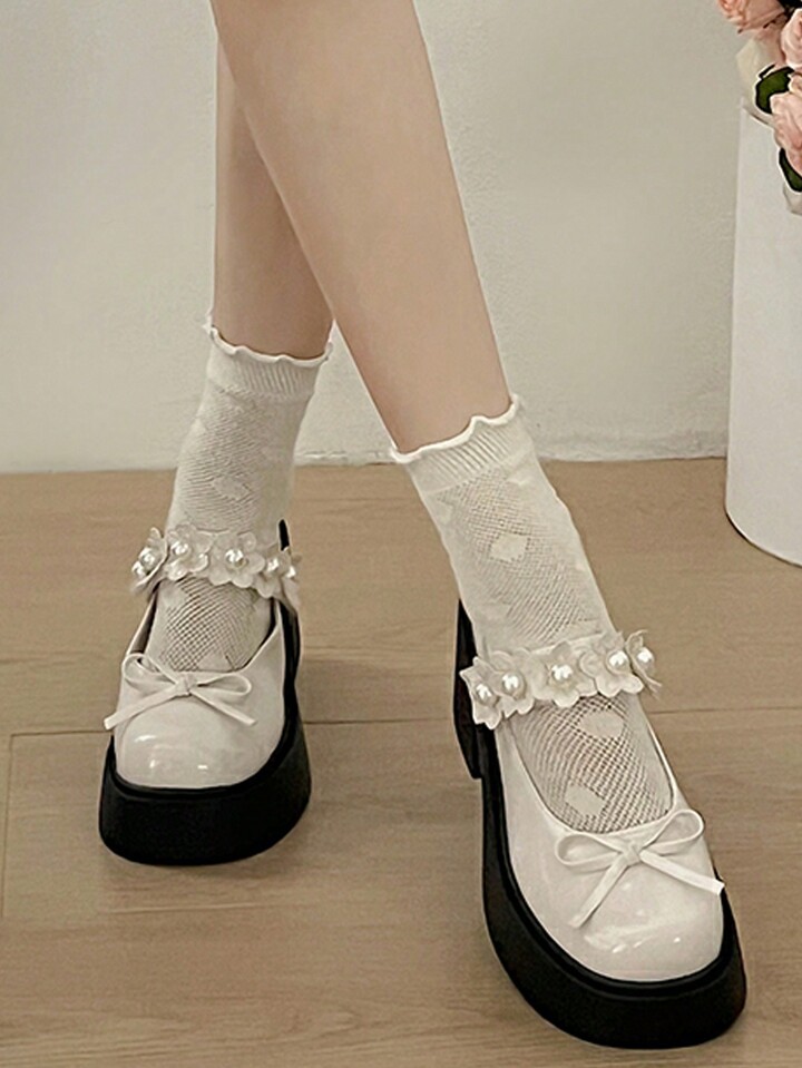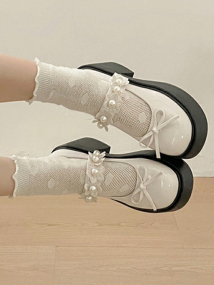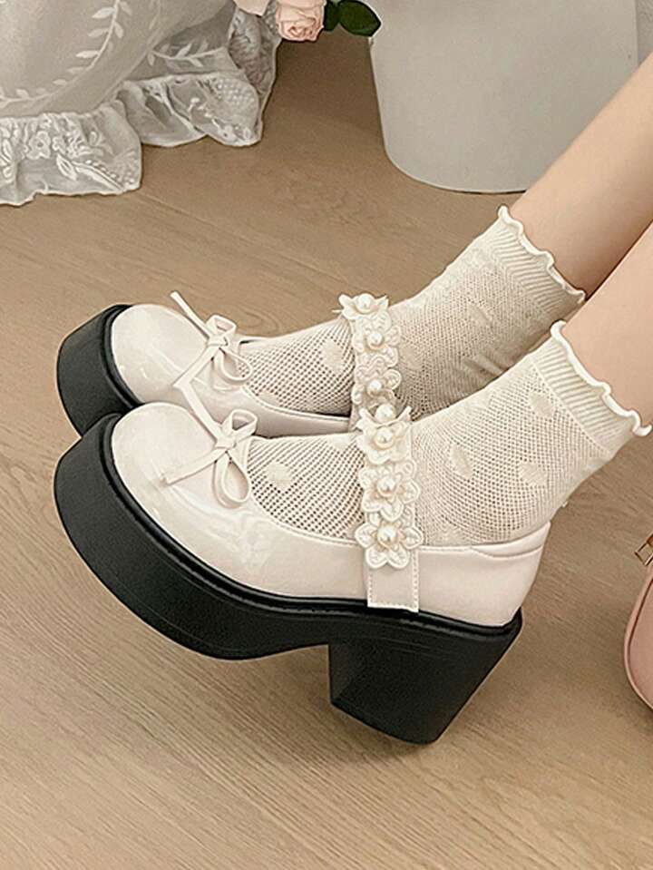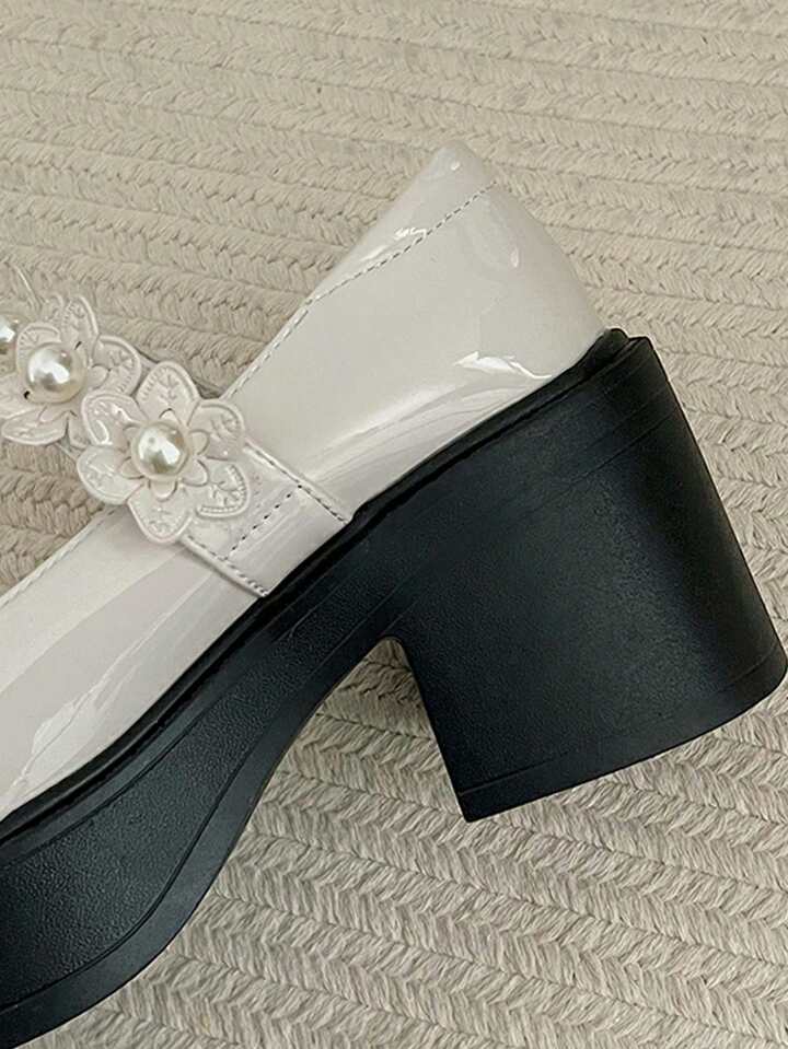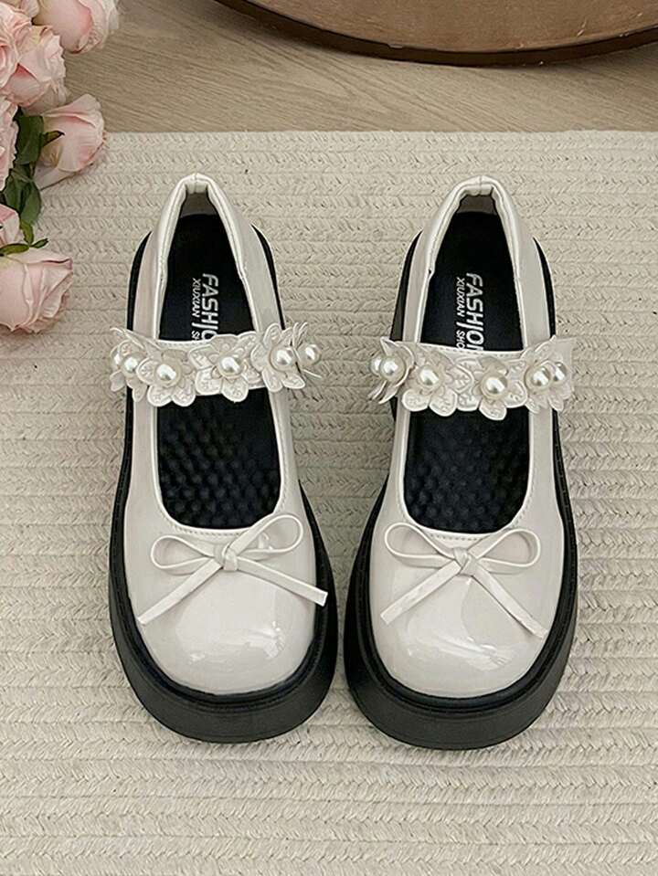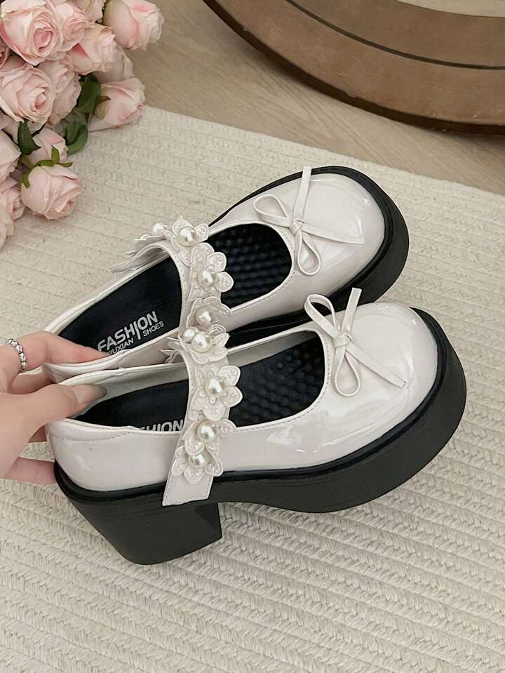 Kawaii Süße und coole Plateau-High-Heels im britischen Vintage-Stil mit klobiger Sohle, niedriges Vorderblatt aus Lackleder, Schleife im japanischen Stil, Lotusblüten- und Perlenverzierung, Mary Jane mit Fesselriemchen und T-Riemchen, Pumps im College-Stil