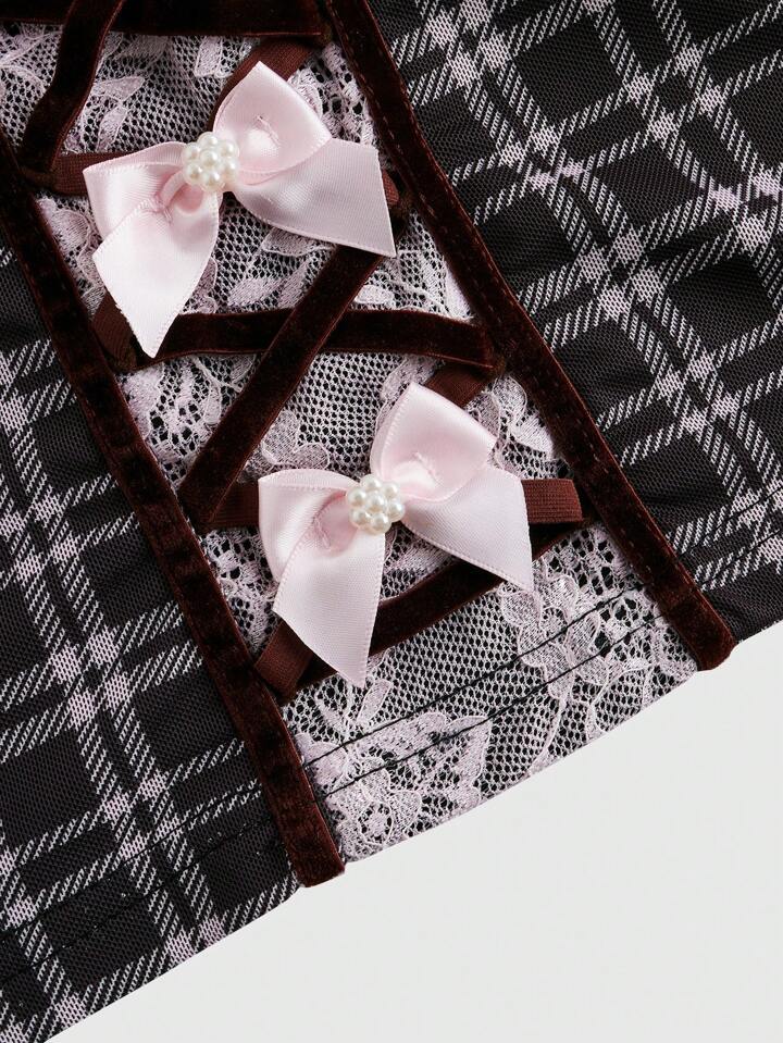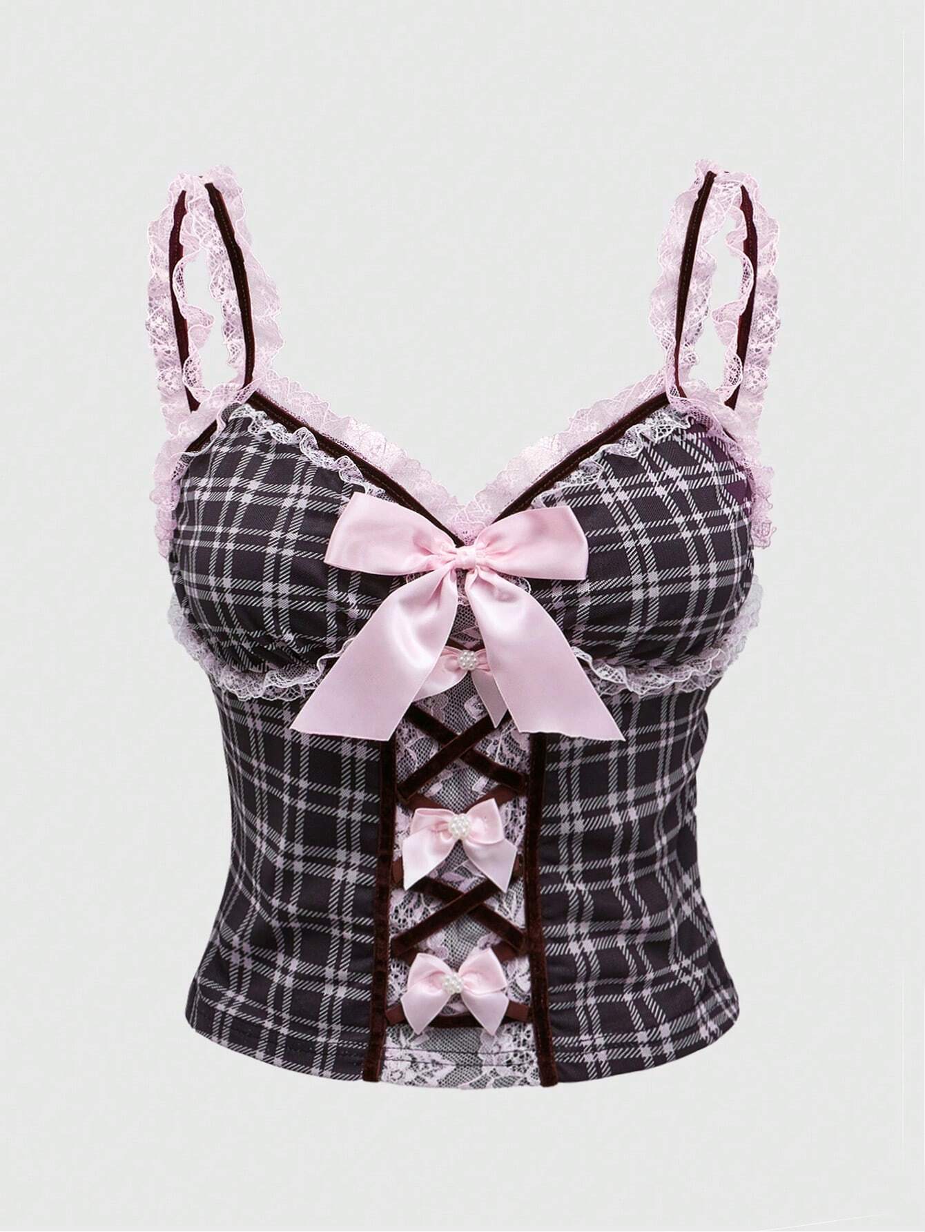 Kawaii Vintage Sweet Rüschen Schleifen karierter Muster Frauen Große Größen Himekaji Trägerhemd, für den Sommer