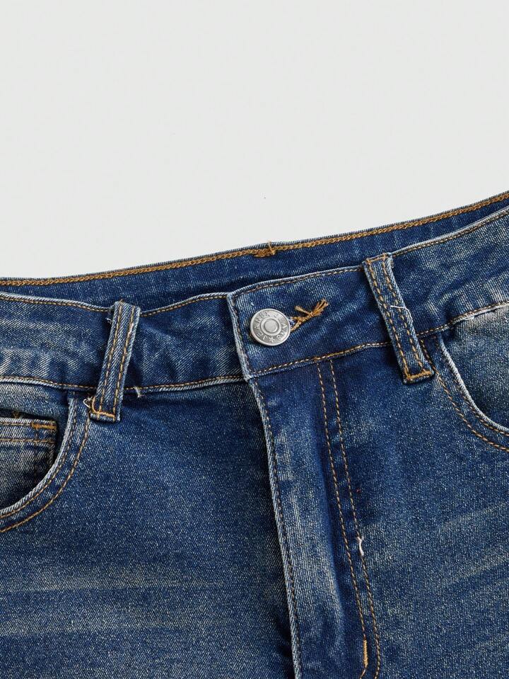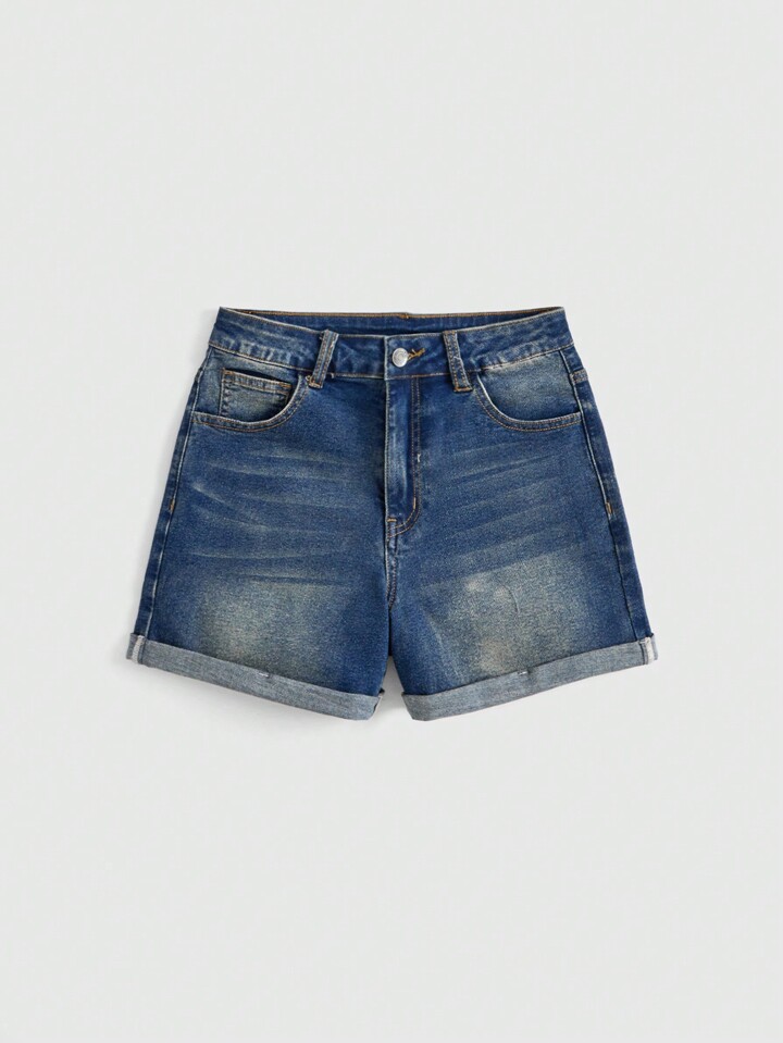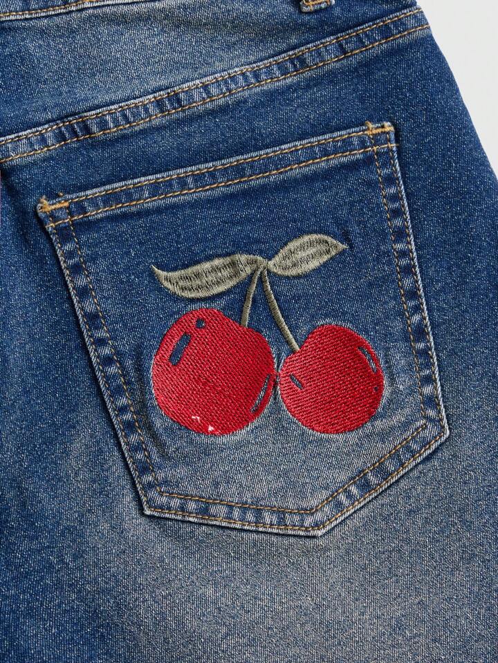 Kawaii Damen Denim Shorts in Lässig Art mit Buchstaben, Kirsch-Stickerei, Taschen und umgeschlagenem Saum, Schule