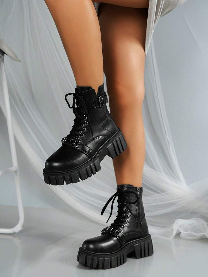 Kawaii Damen Kampfstiefel mit Schnürung vorne und seitlichem Reißverschluss, coole Outdoor Modestiefel