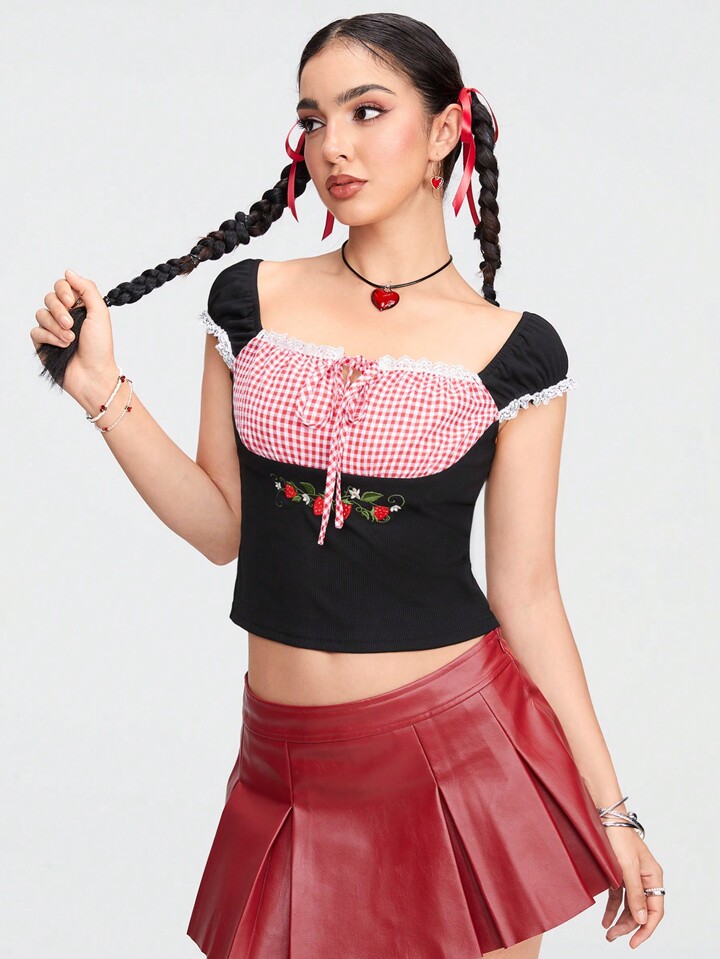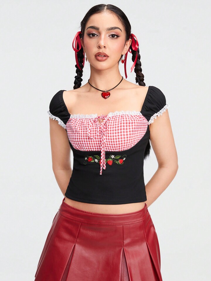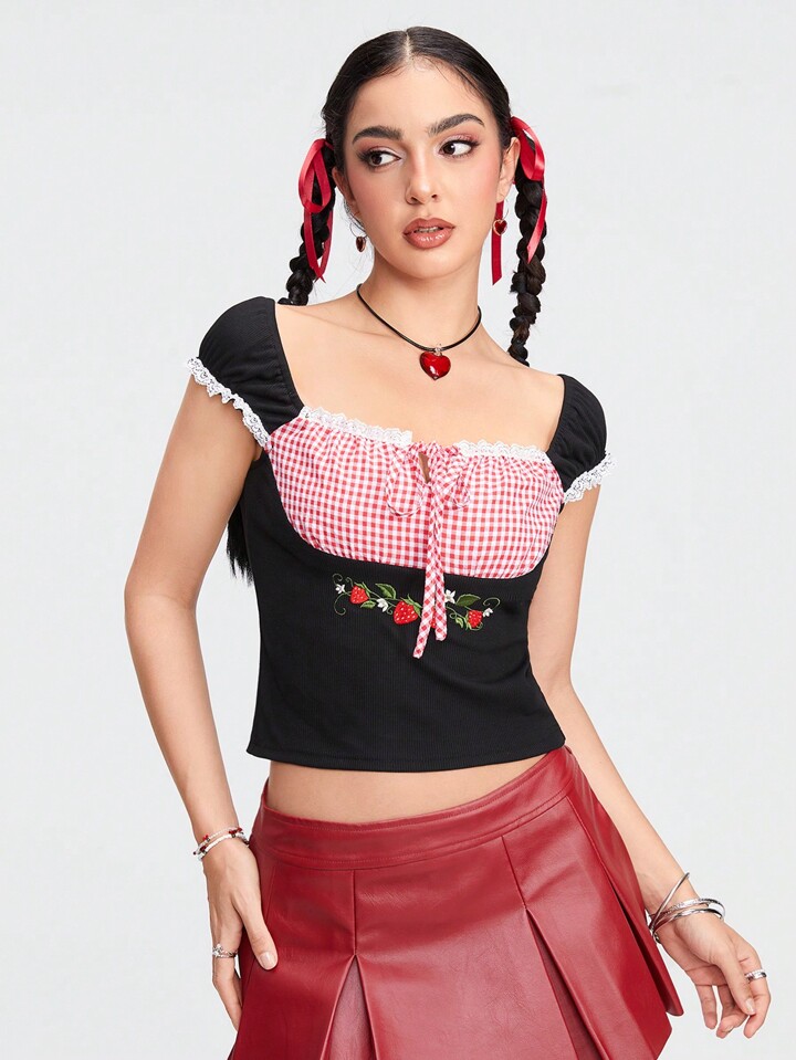 Kawaii Damen Sommer lässig Land süße romantische karierte gespleißte Erdbeer-Stickerei-Muster-T-Shirt