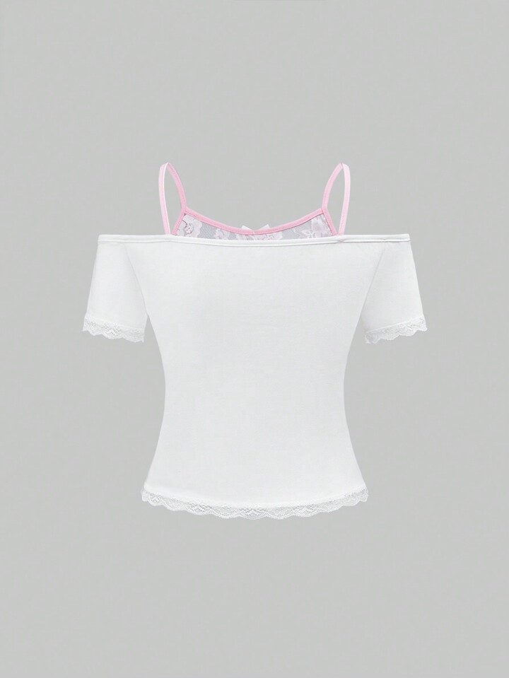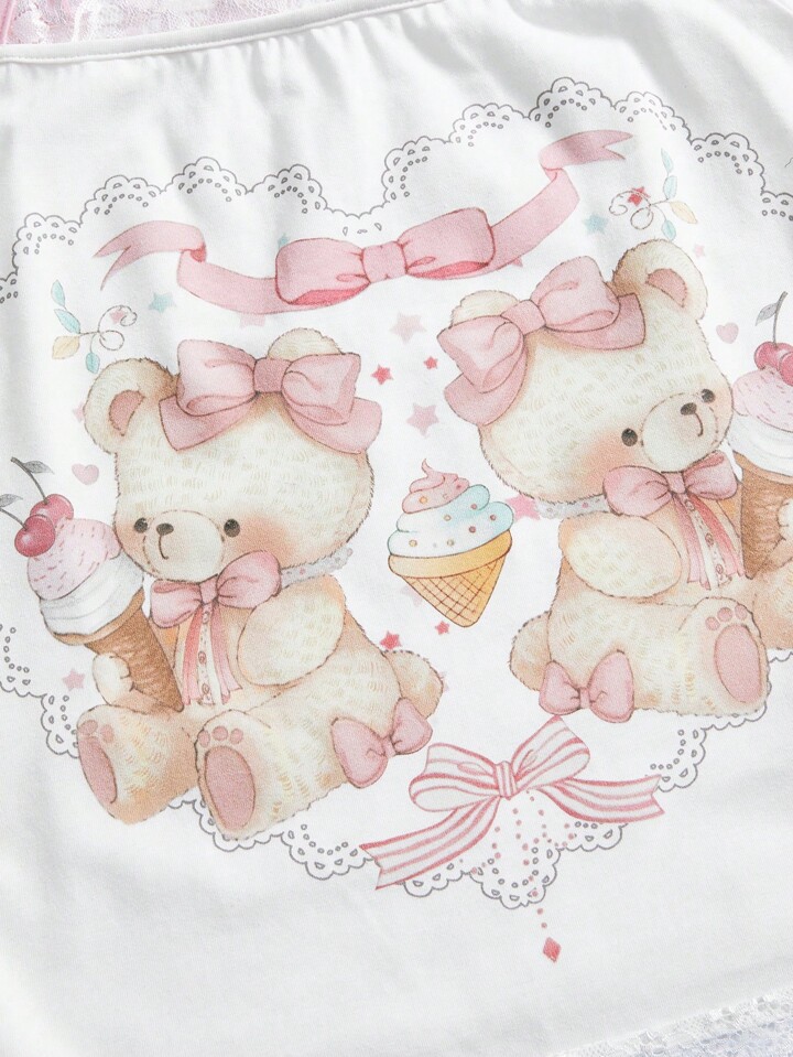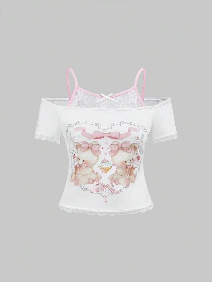 Kawaii Damen 2 in 1 süßer Mädchen Stil Spitzen Patchwork Herz & Bär Spitzenbordüre Schleife T-Shirt