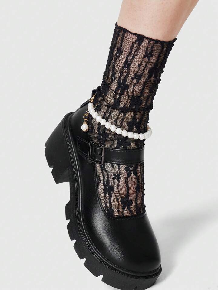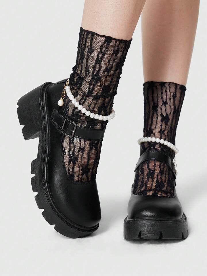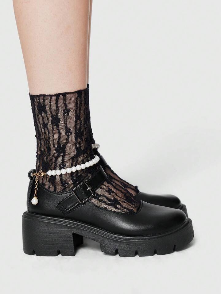 Kawaii Damen Schwarze Mary Jane Schuhe, geschlossene Zehenkappe im Gothic-Stil mit Perlen-Knöchelriemen, Plateau- und dicke Sohle Loafer