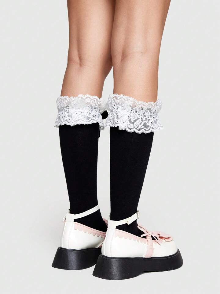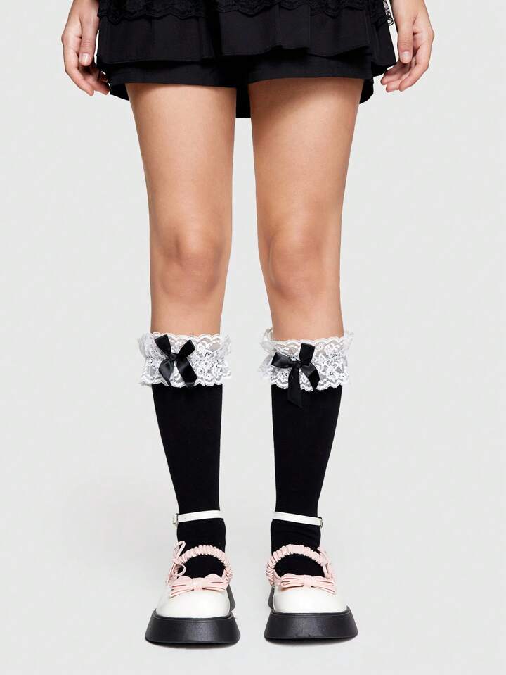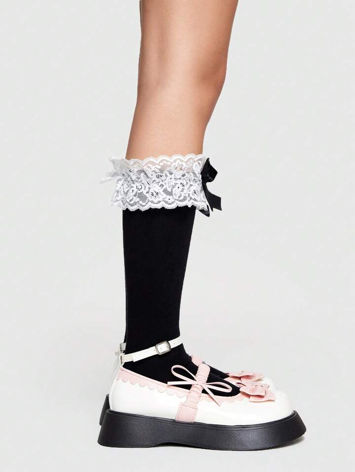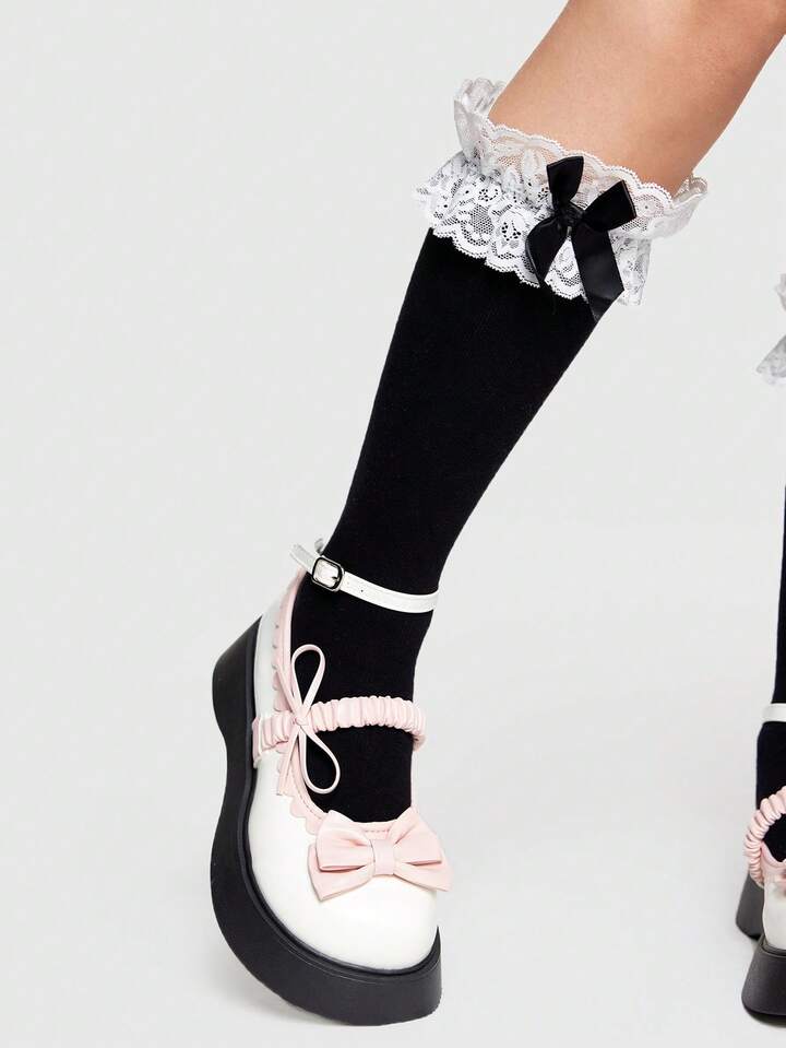 Kawaii Damen Plateau Keilpumps mit Schleifen-Dekor, spitze Kappe, Plateausohle, Farbblockdesign aus PU-Leder, süßer Campus-Stil für Weihnachten, Neujahr, Herbst und Winter