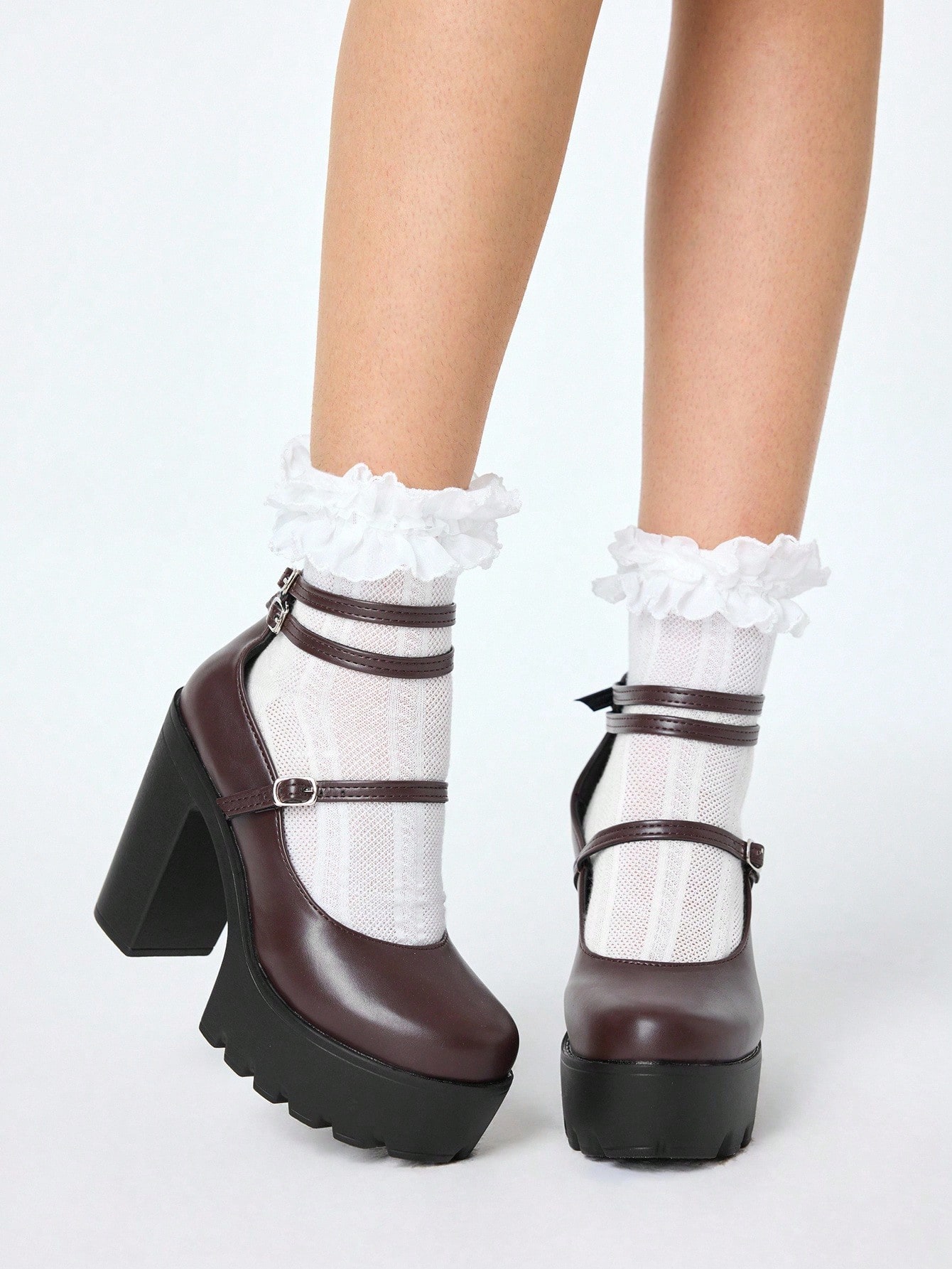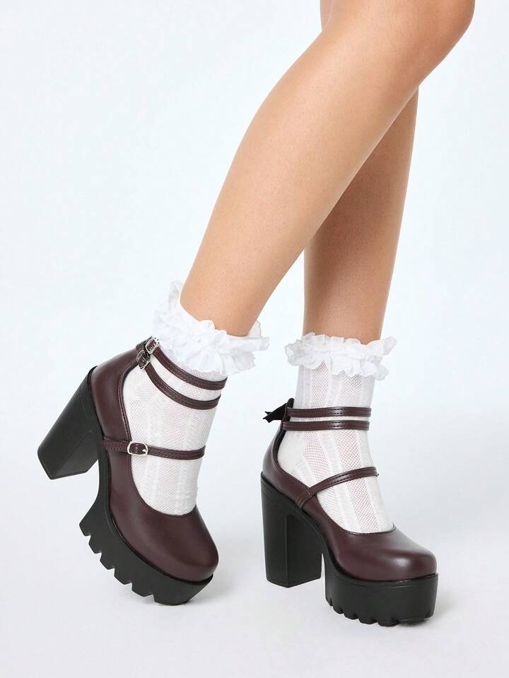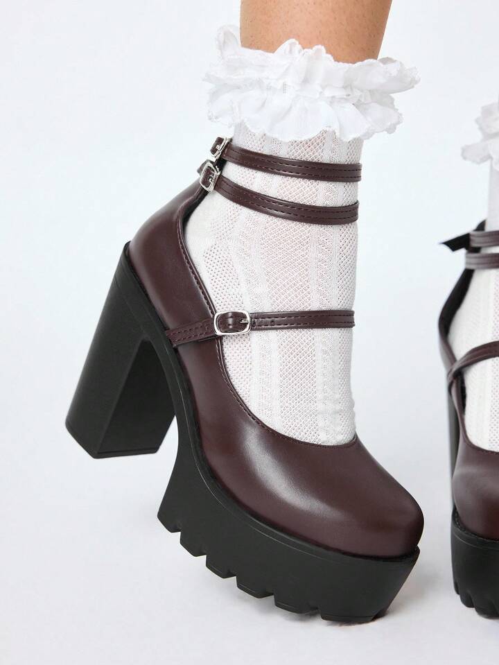 Kawaii Damen braune geschlossene Plateau-Mary-Jane-Schuhe mit Knöchelriemen, wasserdichter Plateau, Mehrfachriemen, Partykleid Pumps