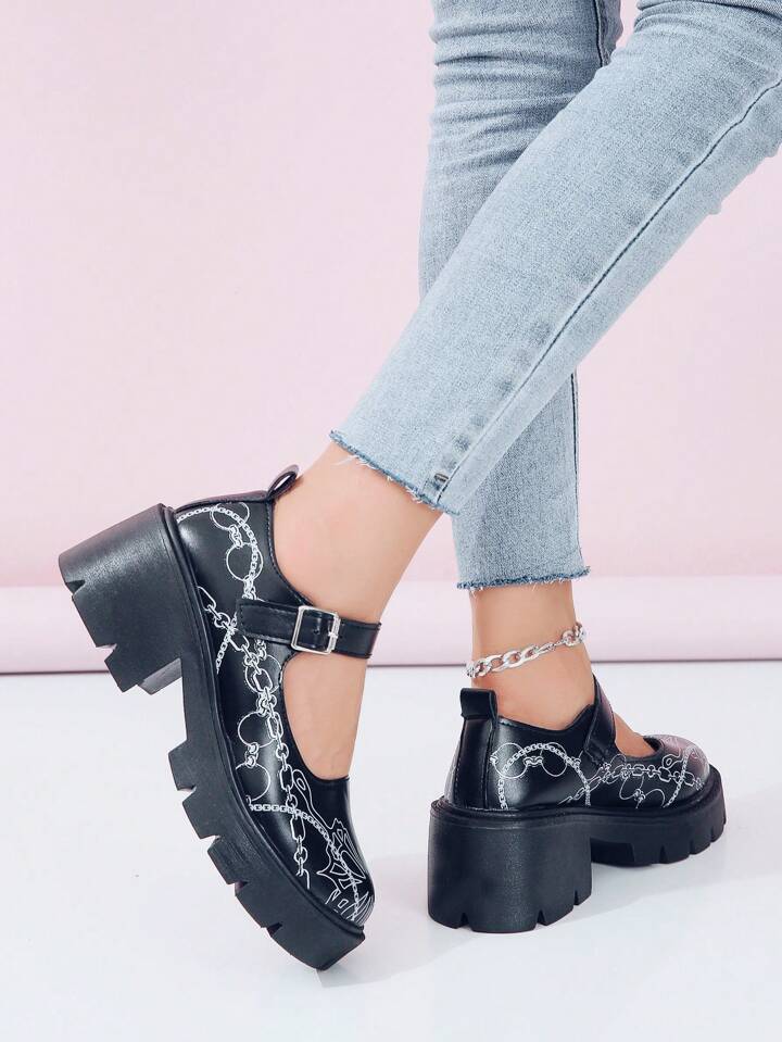 Kawaii Damen Mary Jane Schuhe mit Chunky Plateau und Kettenmuster, im Punk-Stil
