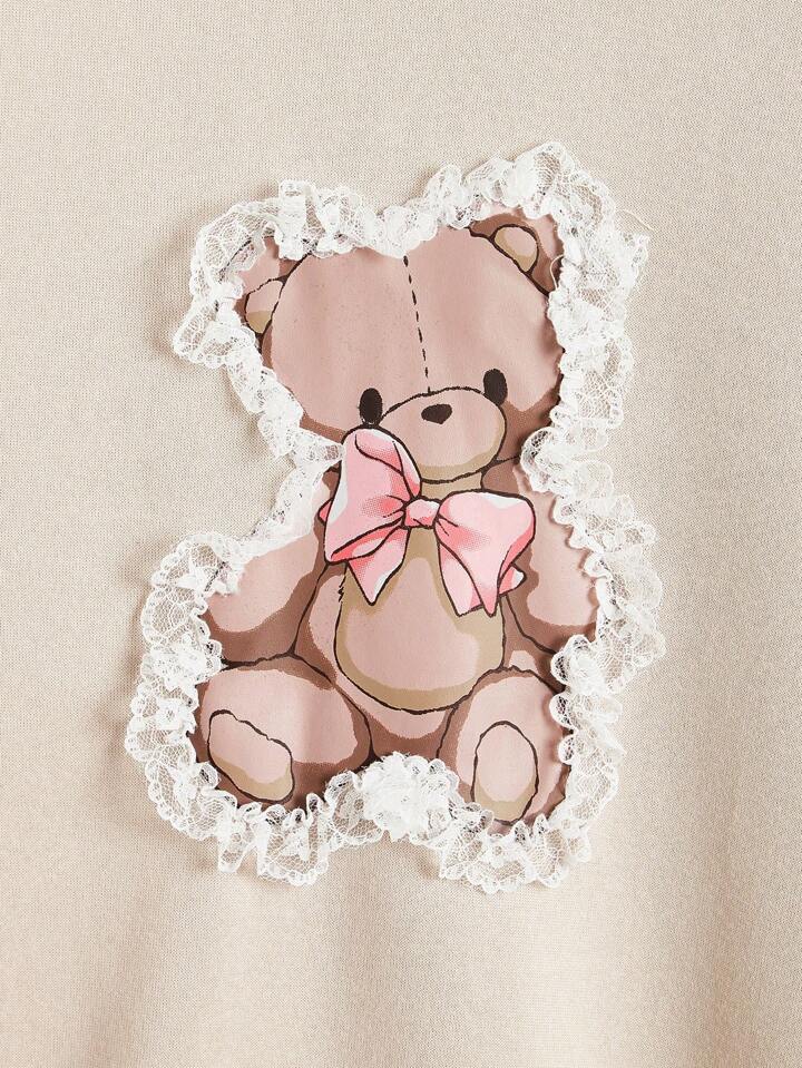 Kawaii Niedliches lässiges Teddy-Sweatshirt für Damen mit Spitze und Blumendetails