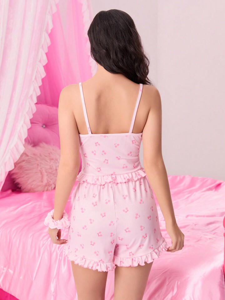 Kawaii Süßes Pyjama-Set aus Camisole und Shorts mit Kirschschleife und Fransen für Damen (mit Haargummi)