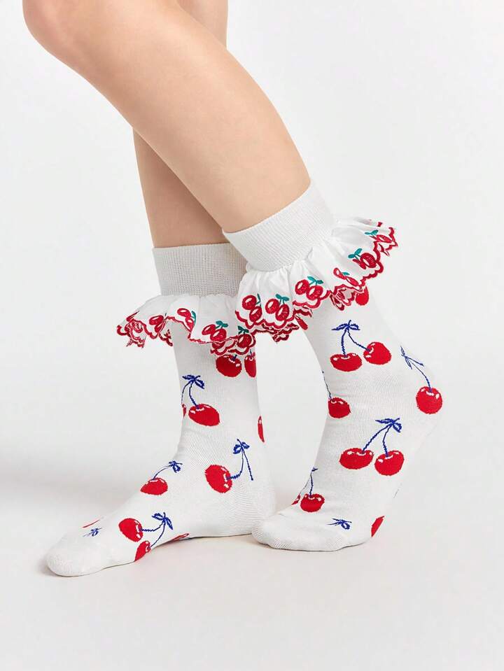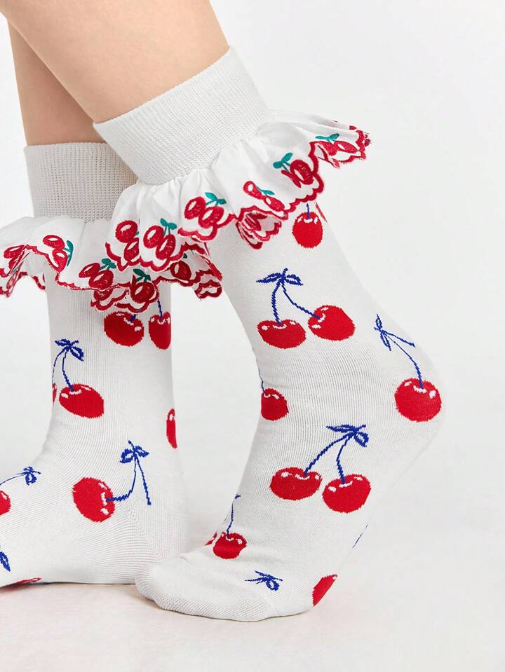 Kawaii Damen süße Kirsch-Muster Rüschen-Saum Socken bis zur Mitte des Wadenbein