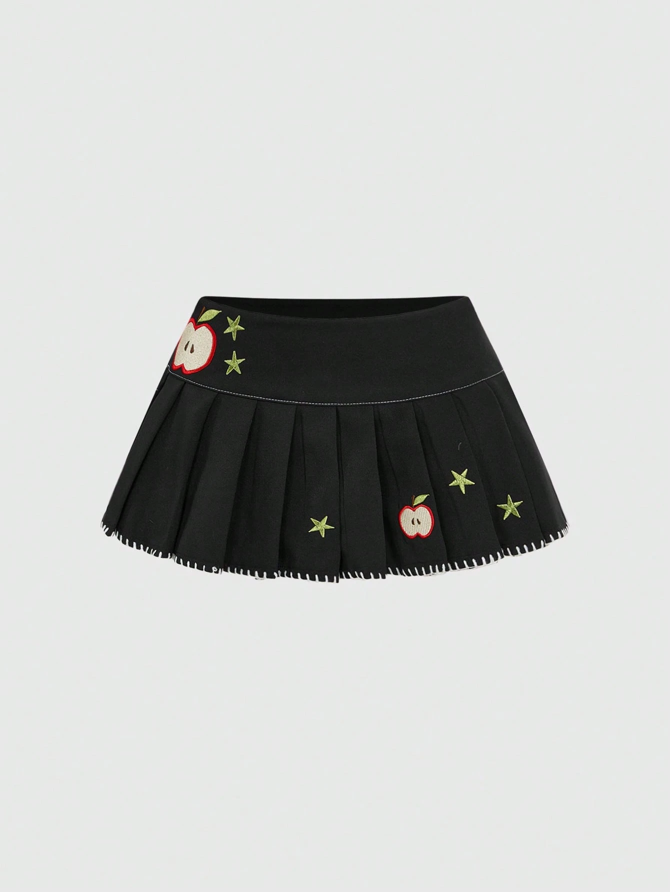 Kawaii Damen süßer Schulstil, vielseitig einsetzbarer Minirock mit Falten, Apfel- und Stern-Stickerei, super taillennah