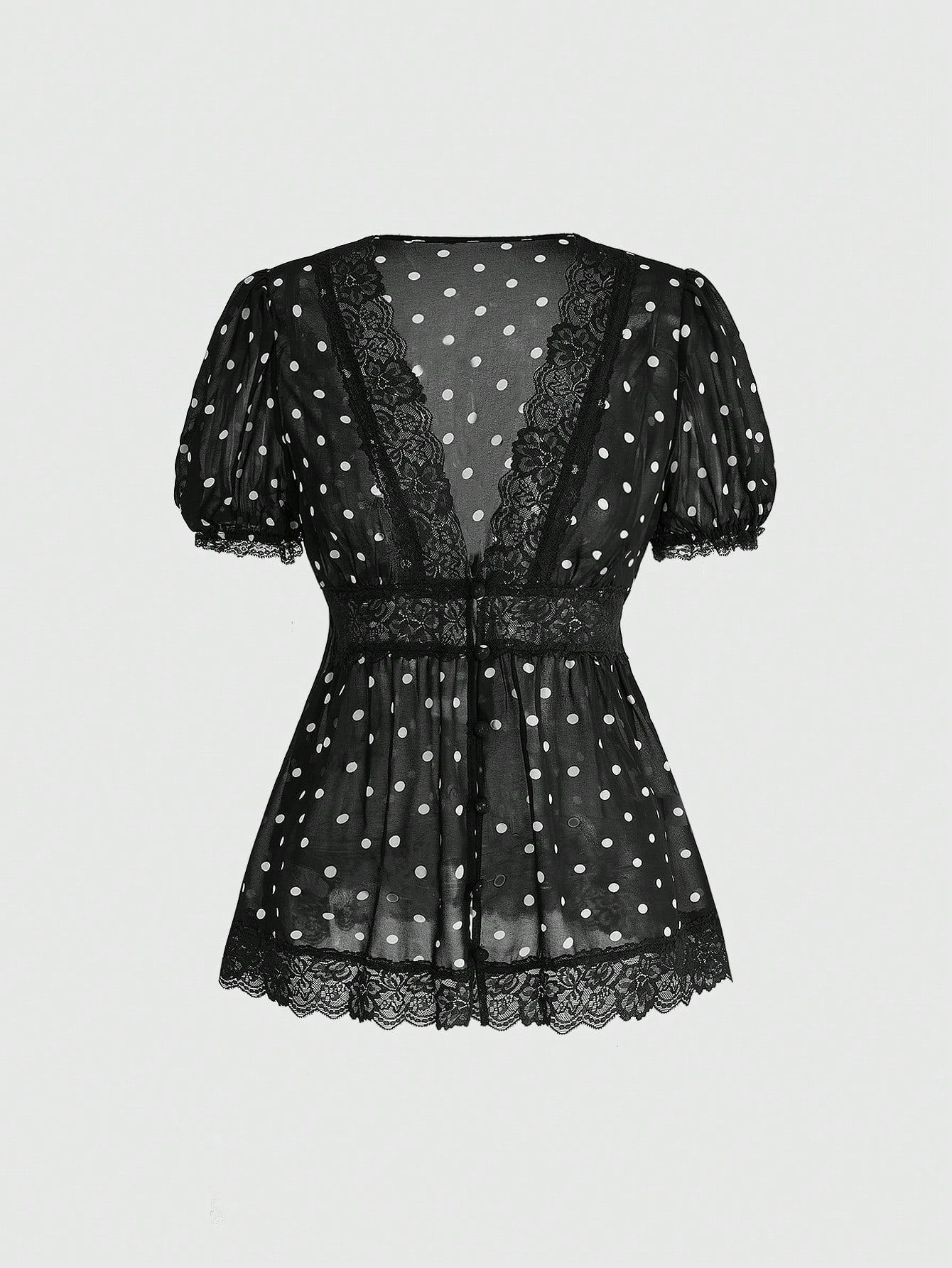 Kawaii Damen Retro Transparente Spitzen Patchwork Polka Dot Bluse