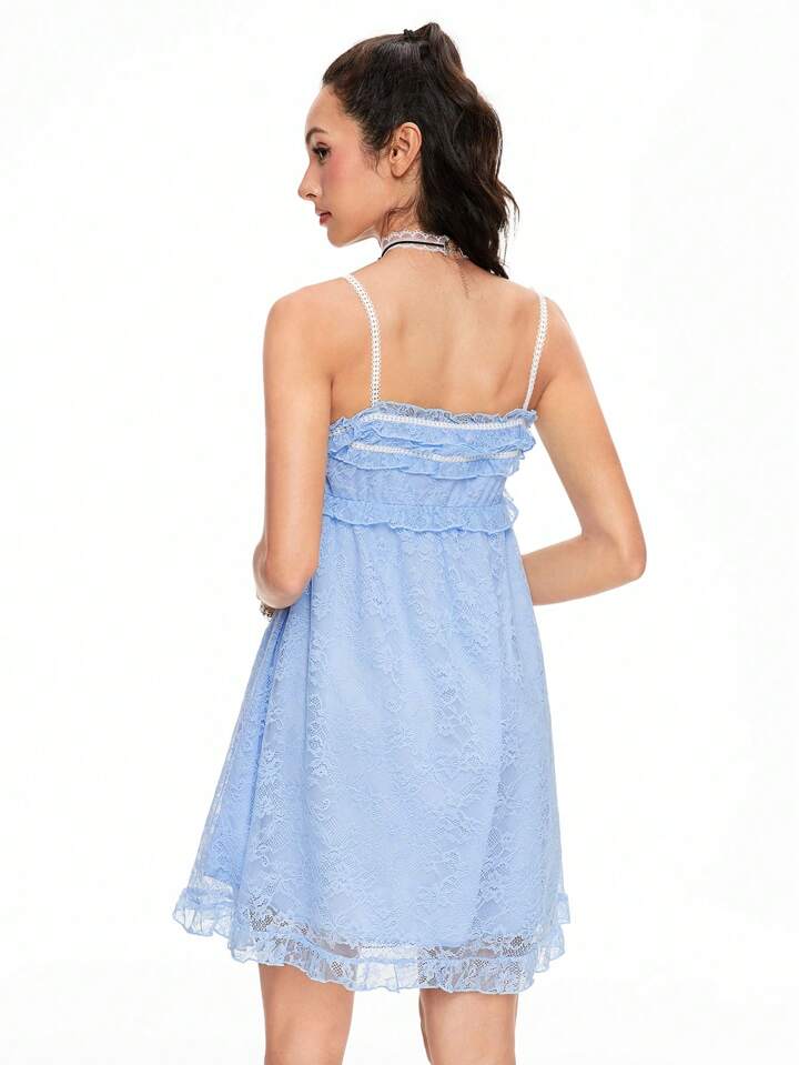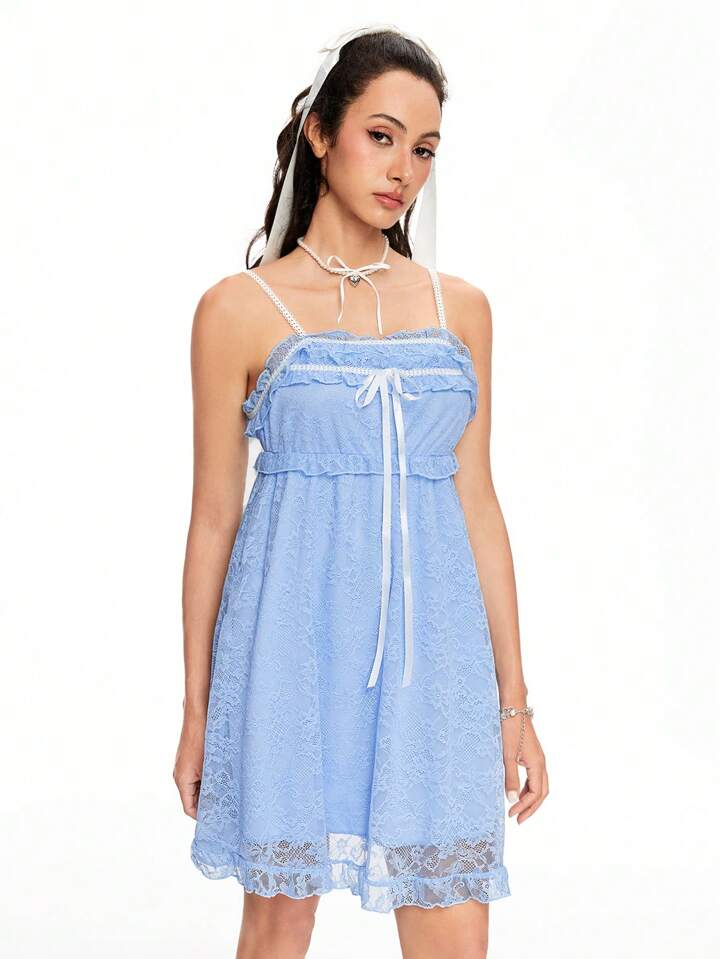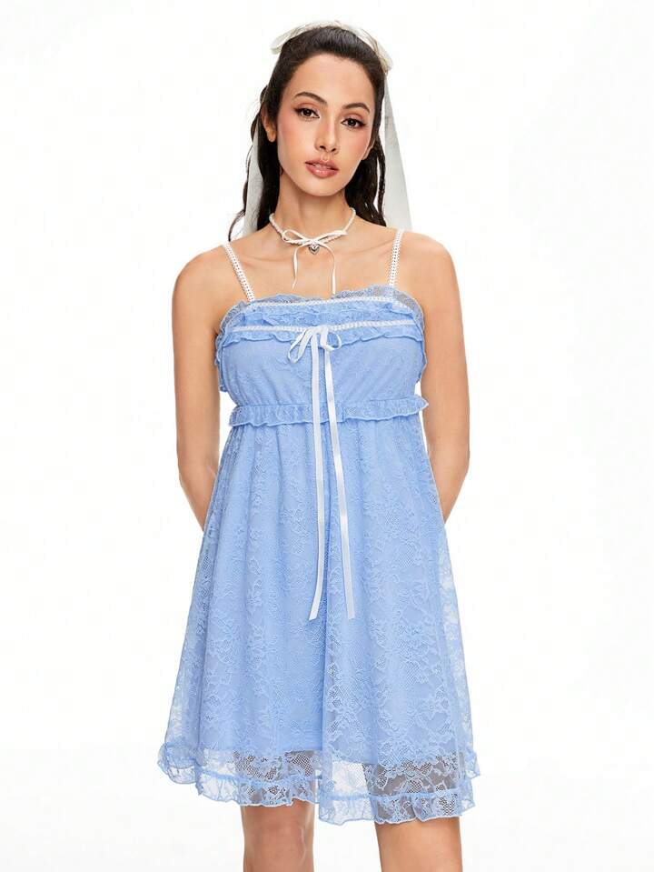 Kawaii Damen Spaghetti-Träger rückenfrei gebundenes Kontrastspitzeneleg-antes süßes Babydoll-Kleid