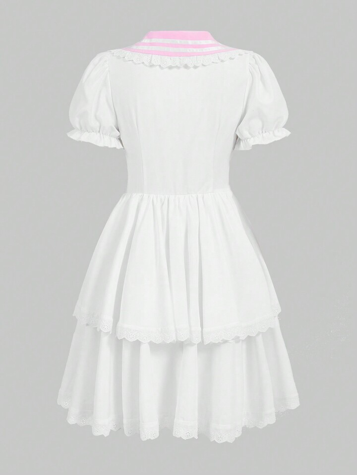 Kawaii Gestreiftes, Doppellagiges Kleid Für Frauen Mit Gürtel Und Rüschen Am Saum