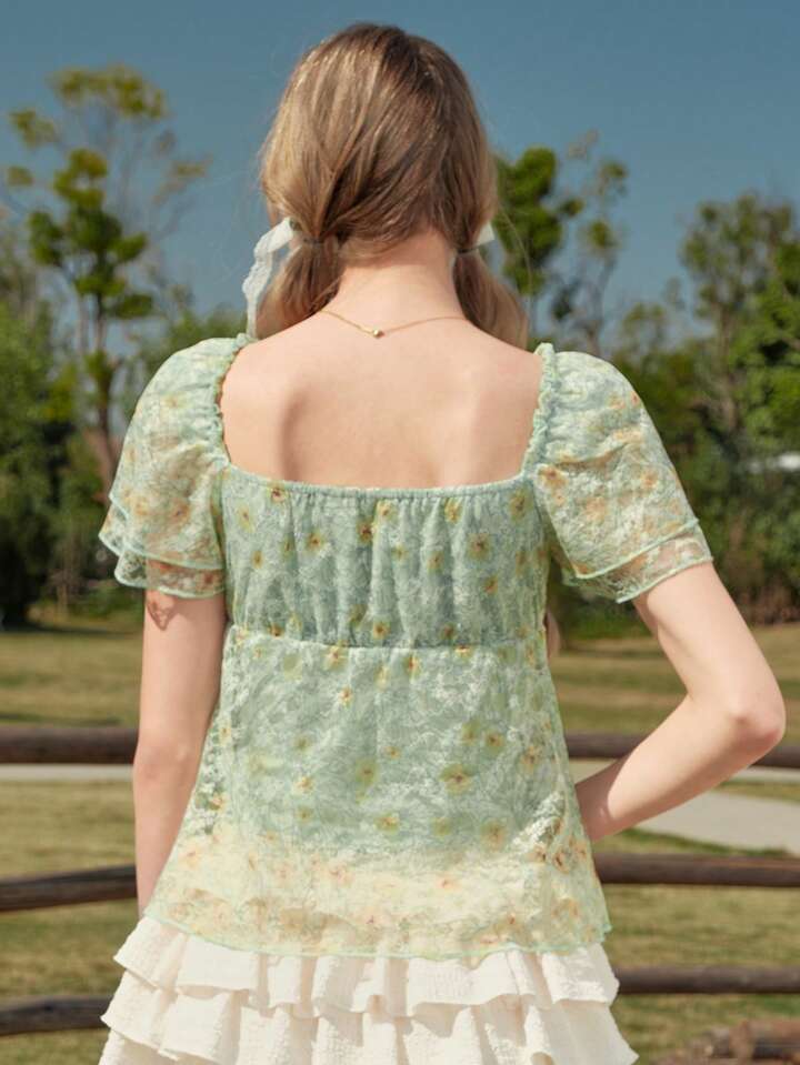 Kawaii Damen Y2K 2000er Jahre süßes Blümchen Rüschen Kurzarm Babydoll Bluse