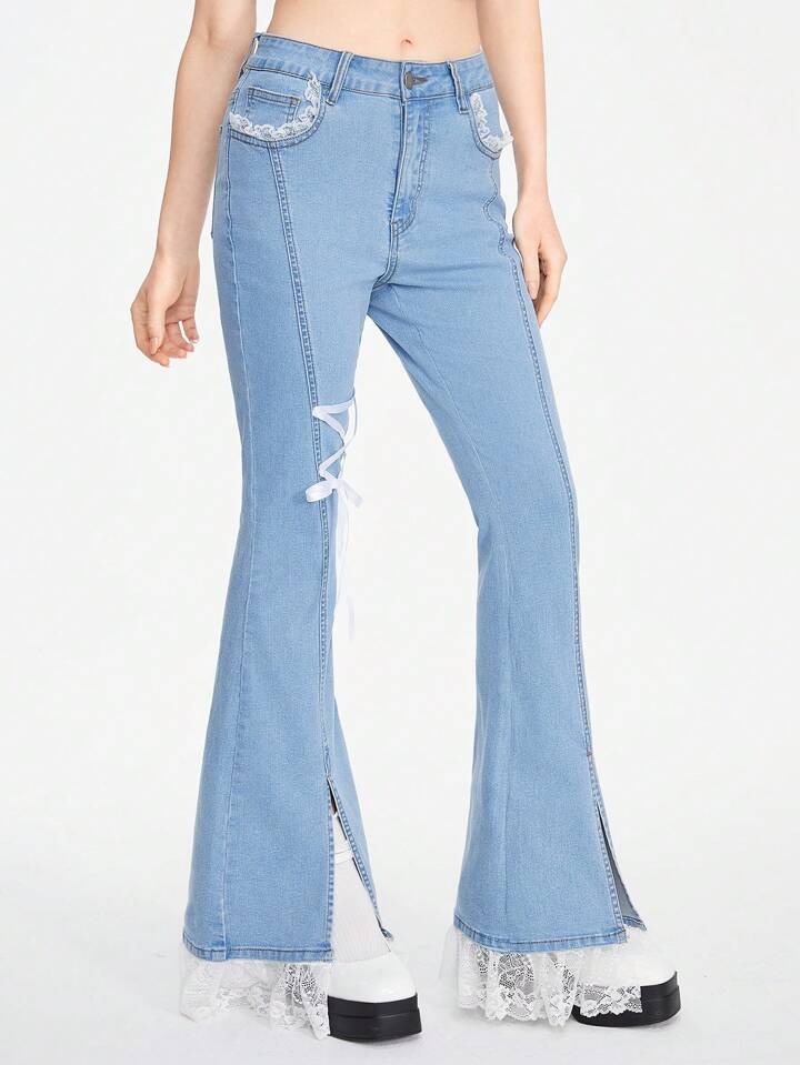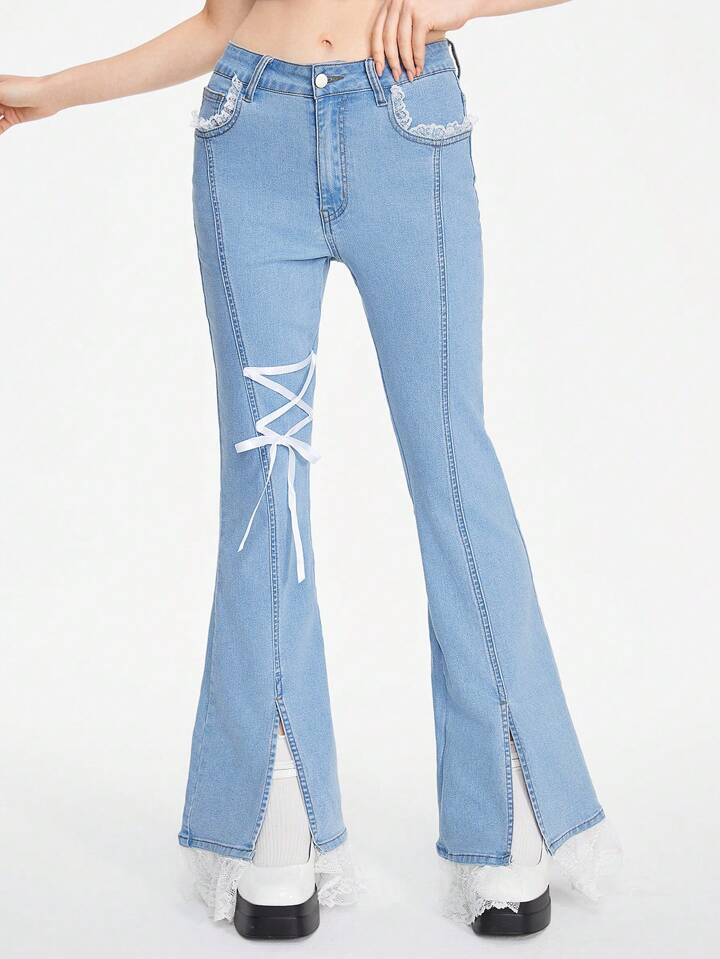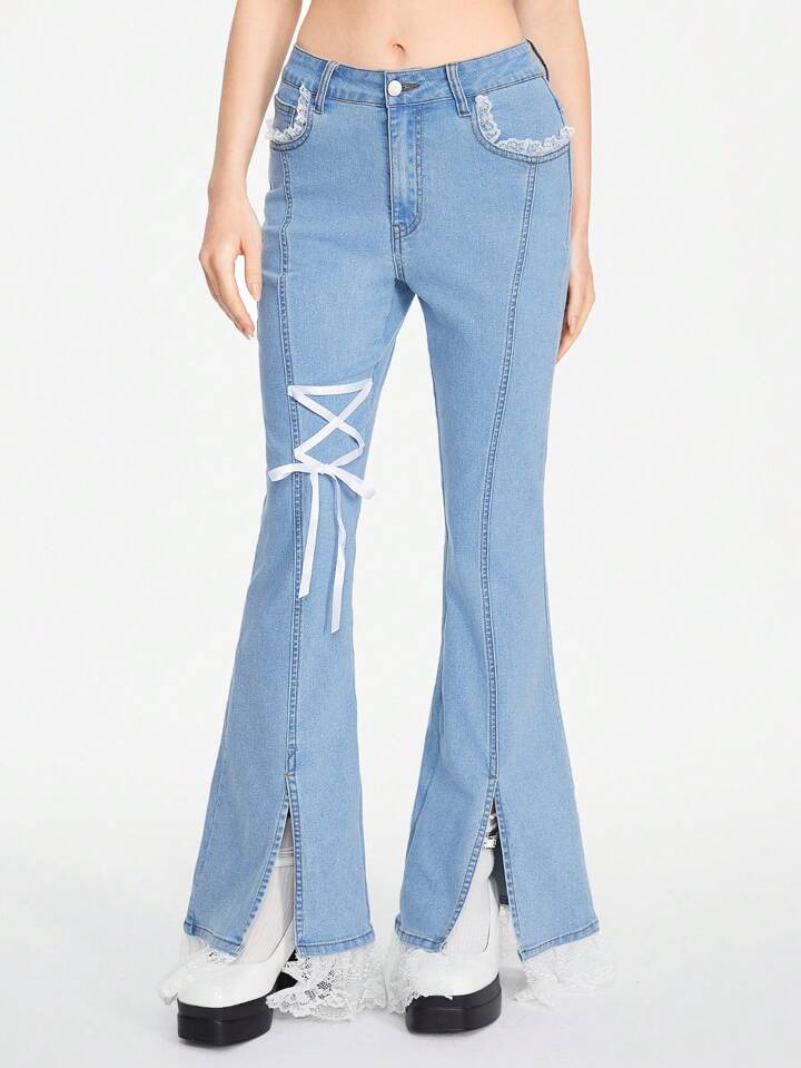 Kawaii Lace Cross-Tie geteilte ausgestellte Jeans im Y2K-Stil für Damen