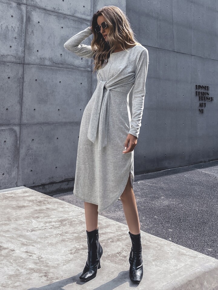 Strick Kleid mit Knoten vorn und gebogenem Saum