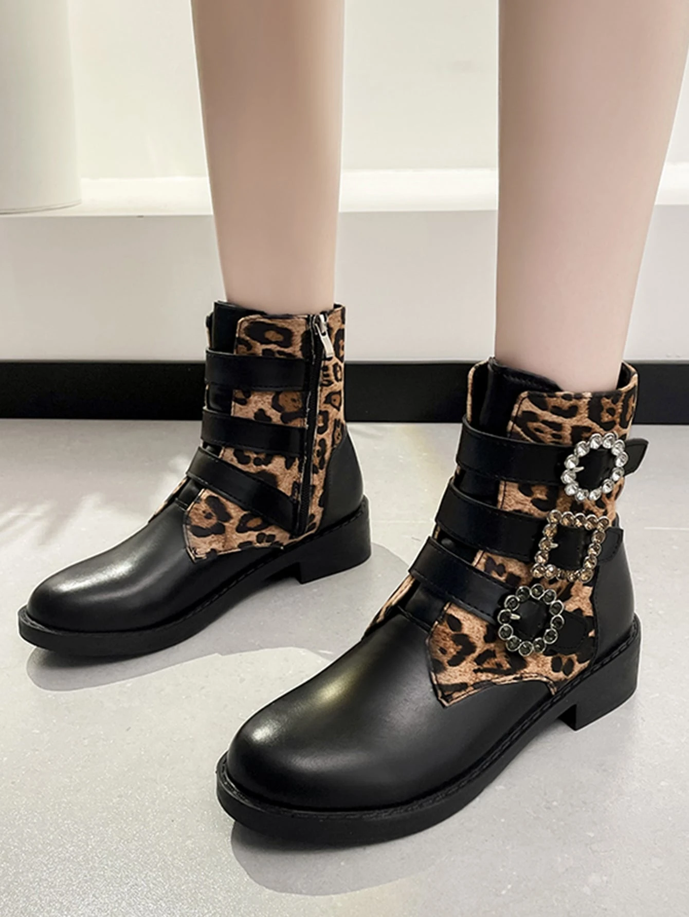 Kampfstiefel mit Leopard Muster, Strass, & Schnalle Dekor, klobigem Absatz