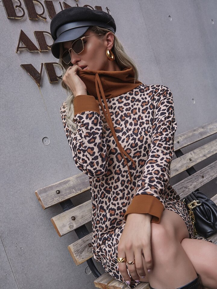 Sweatshirt-Kleid mit Leopard Muster, Schnürung und Trichterhals