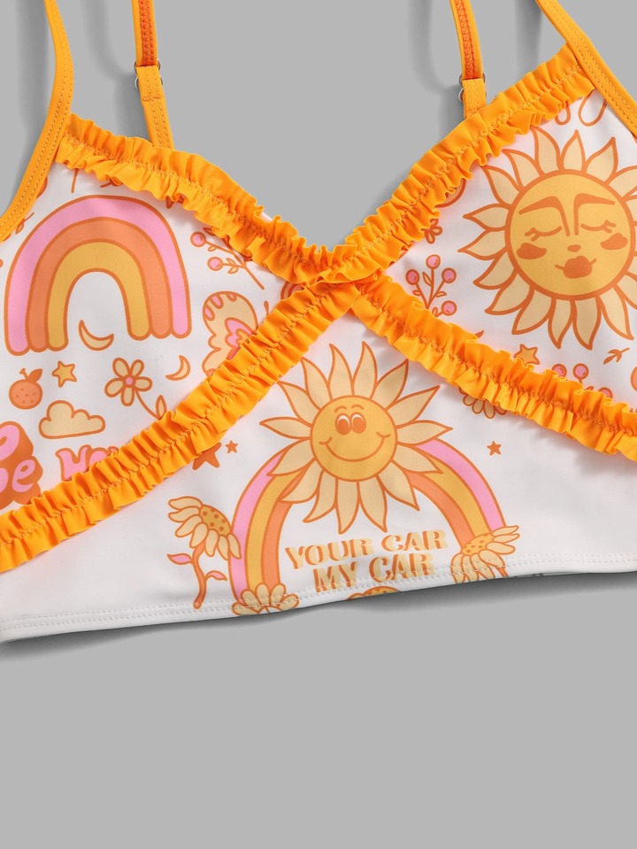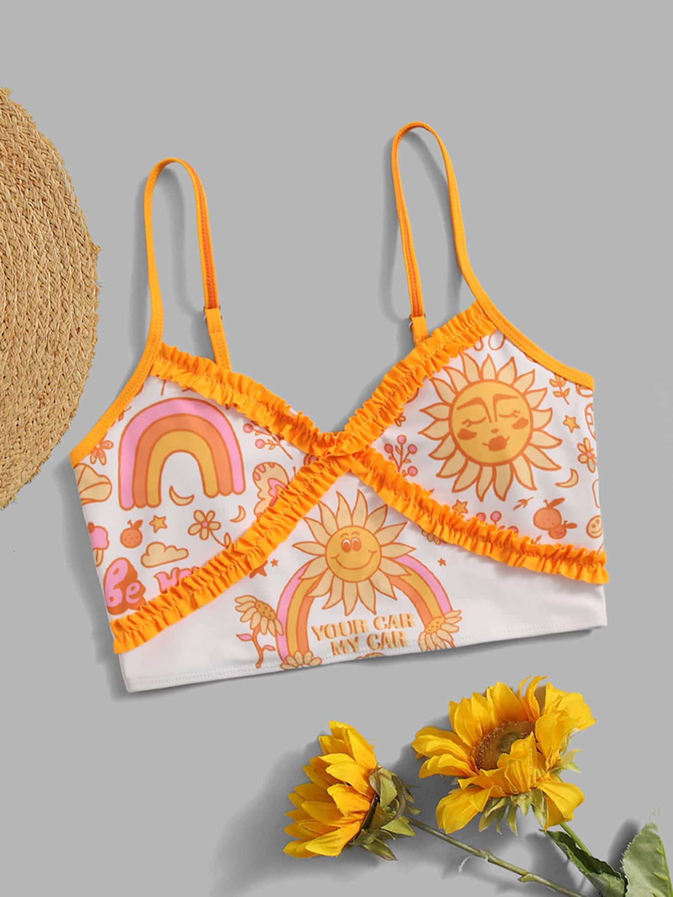 Bikini Top mit Buchstabe Cartoon Grafik, Rüschen