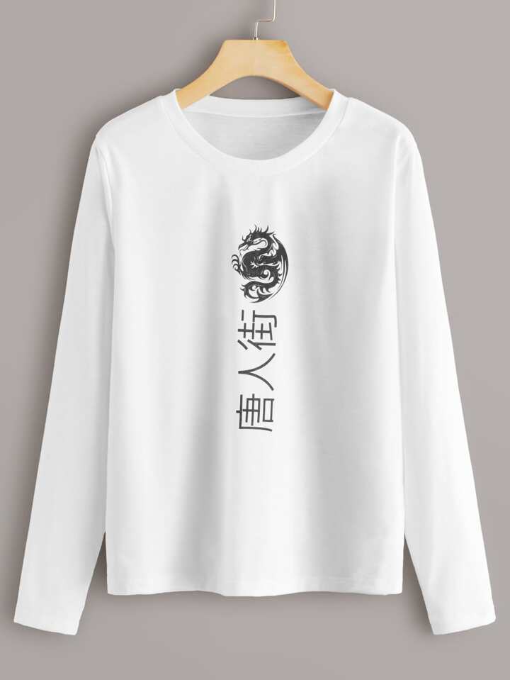 T-Shirt mit Buchstaben, Drachen Muster und langen Ärmeln