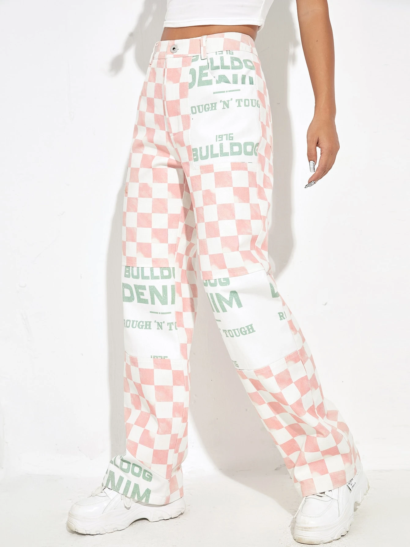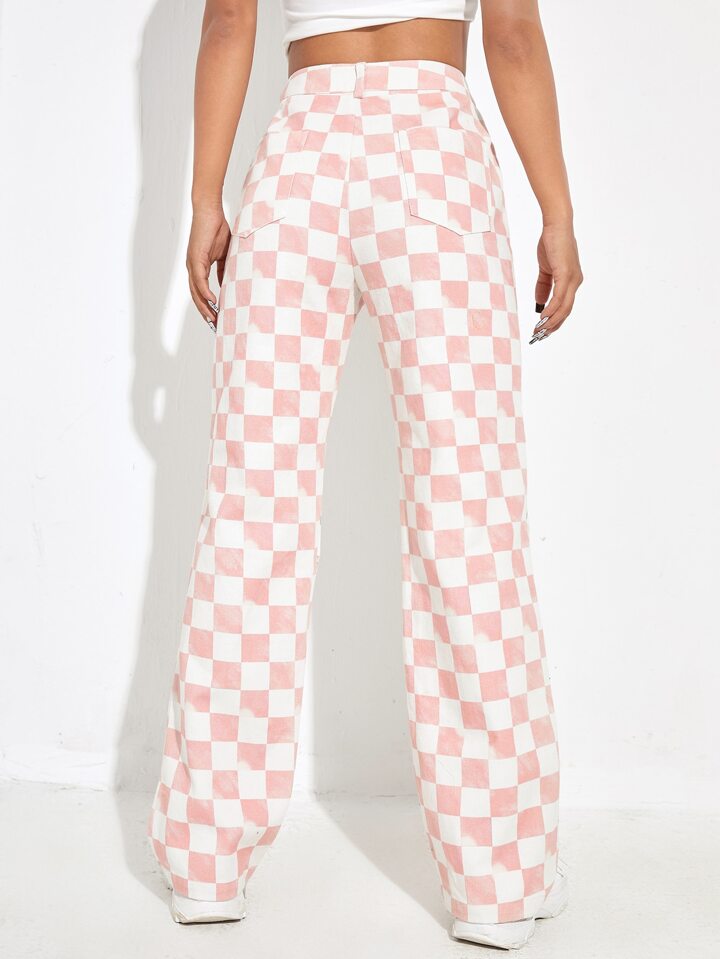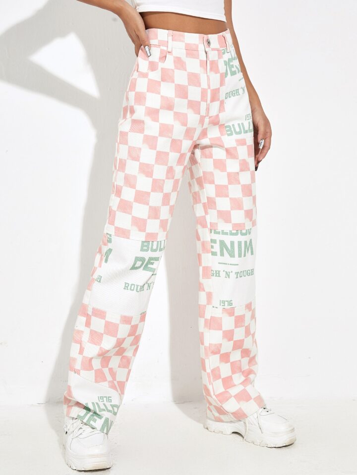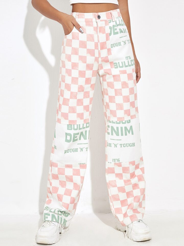 Hose mit Buchstaben Grafik & Schachbrettmuster, hoher Taille