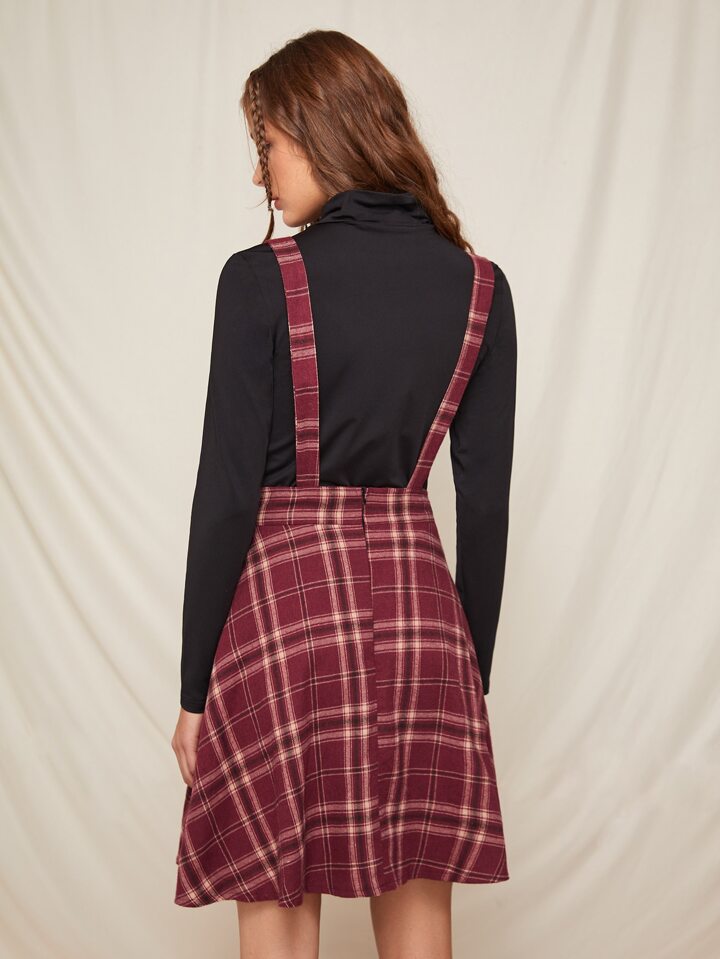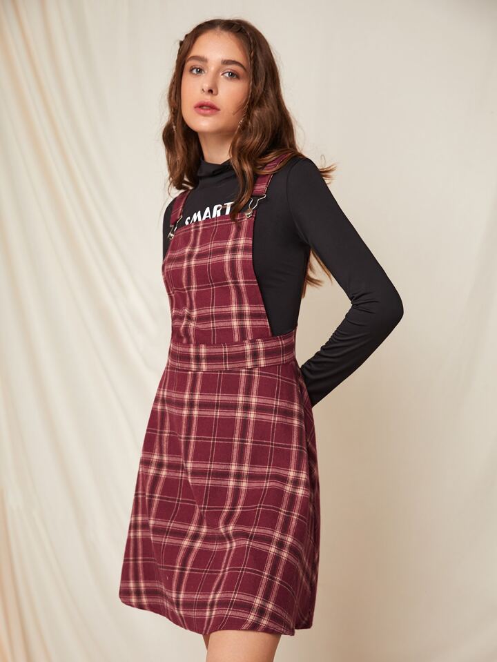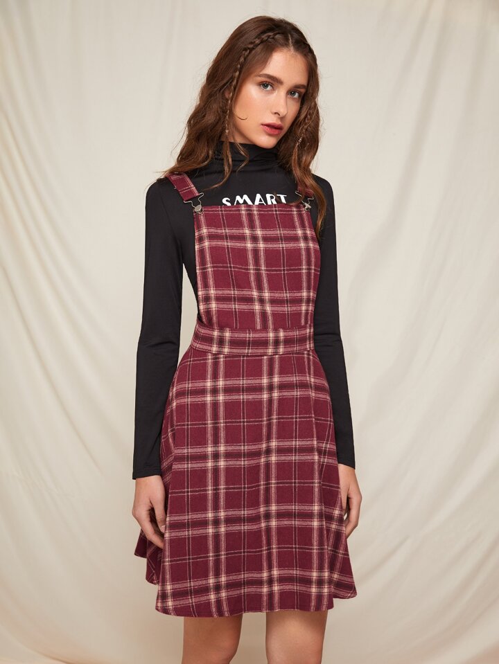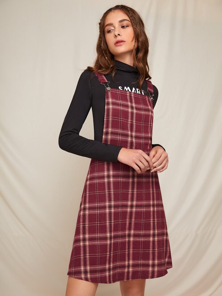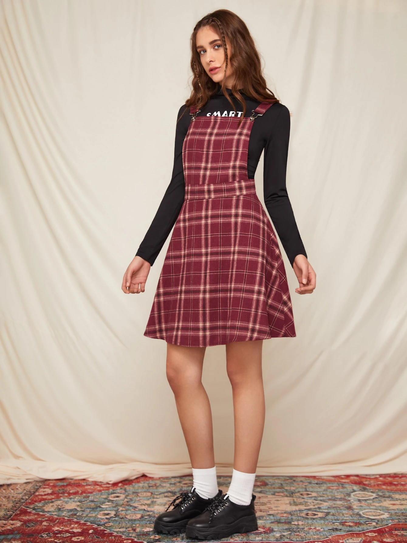 T-Shirt mit Buchstaben Grafik, Stehkragen & Trägerkleid mit Plaid Muster