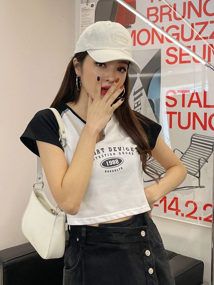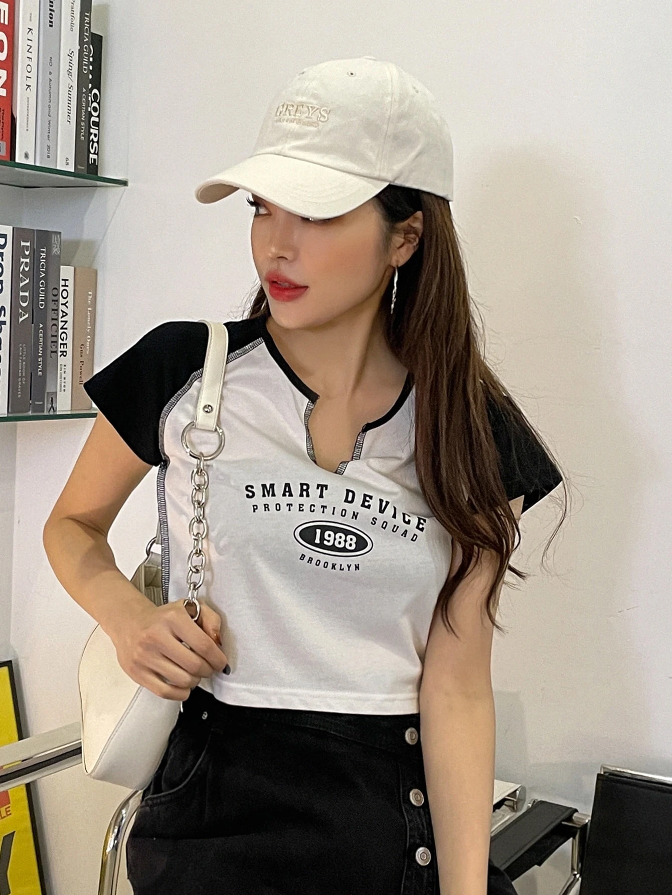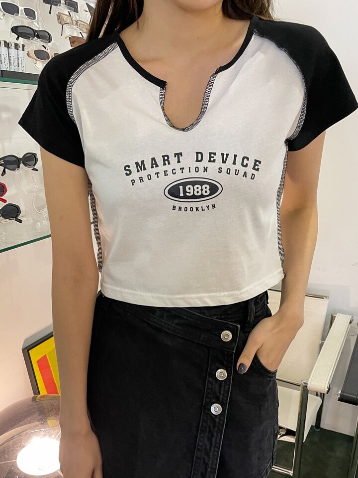 T-Shirt mit Buchstaben Grafik, eingekerbtem Kragen, Absteppen, Raglanärmeln