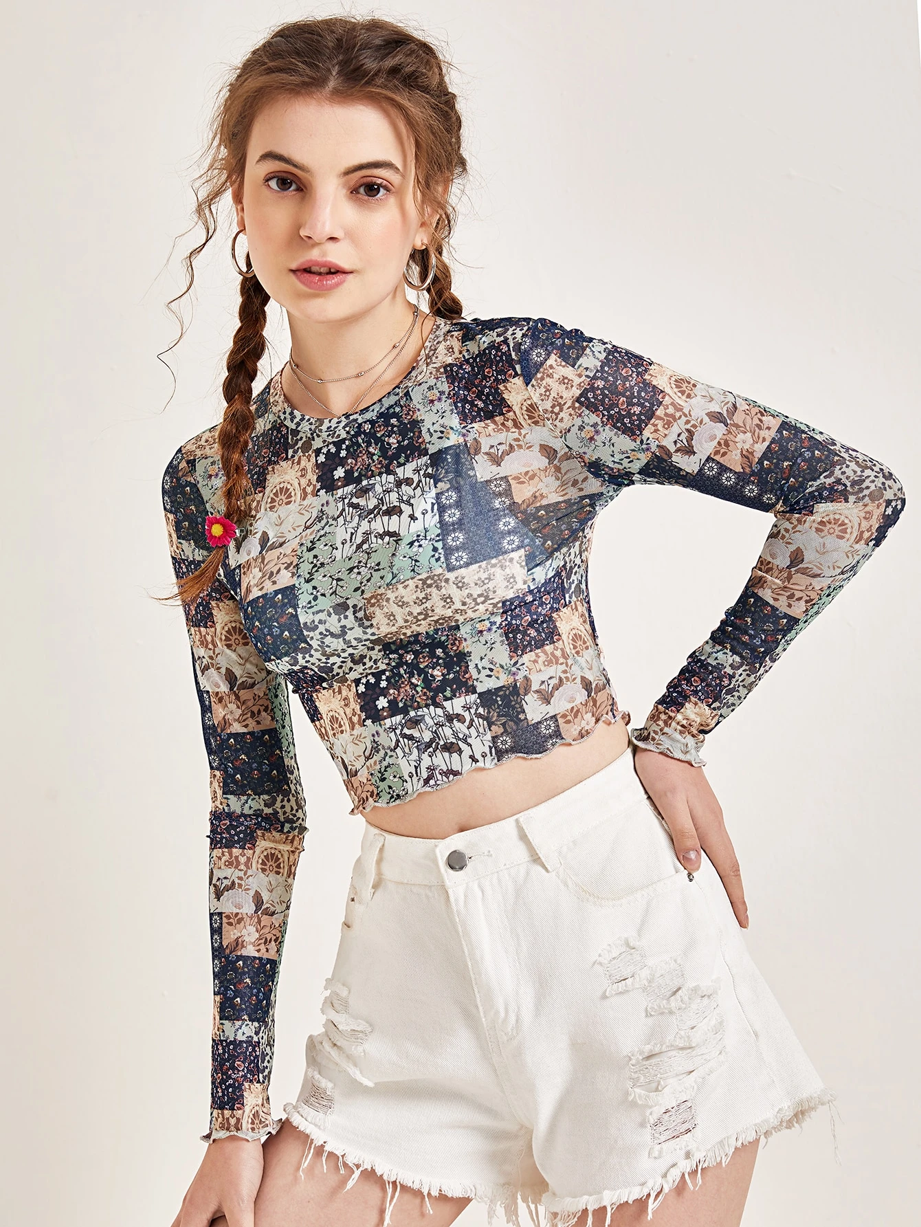 Mesh Crop Top mit gewelltem Saum und Patchwork Muster