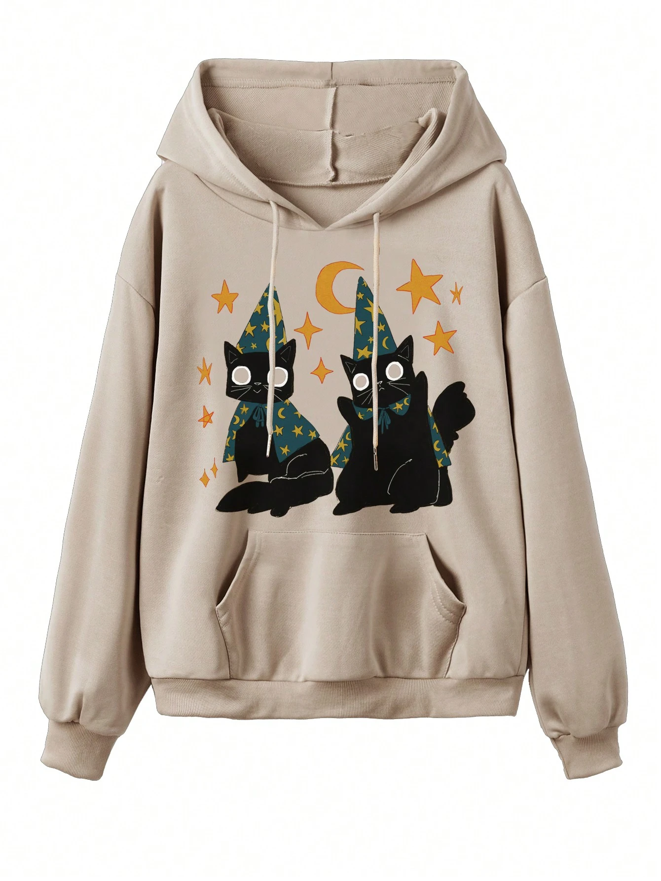 Libbyframe Hoodie mit Katze & Mond Muster, Känguru-Tasche, Tunnelzug,