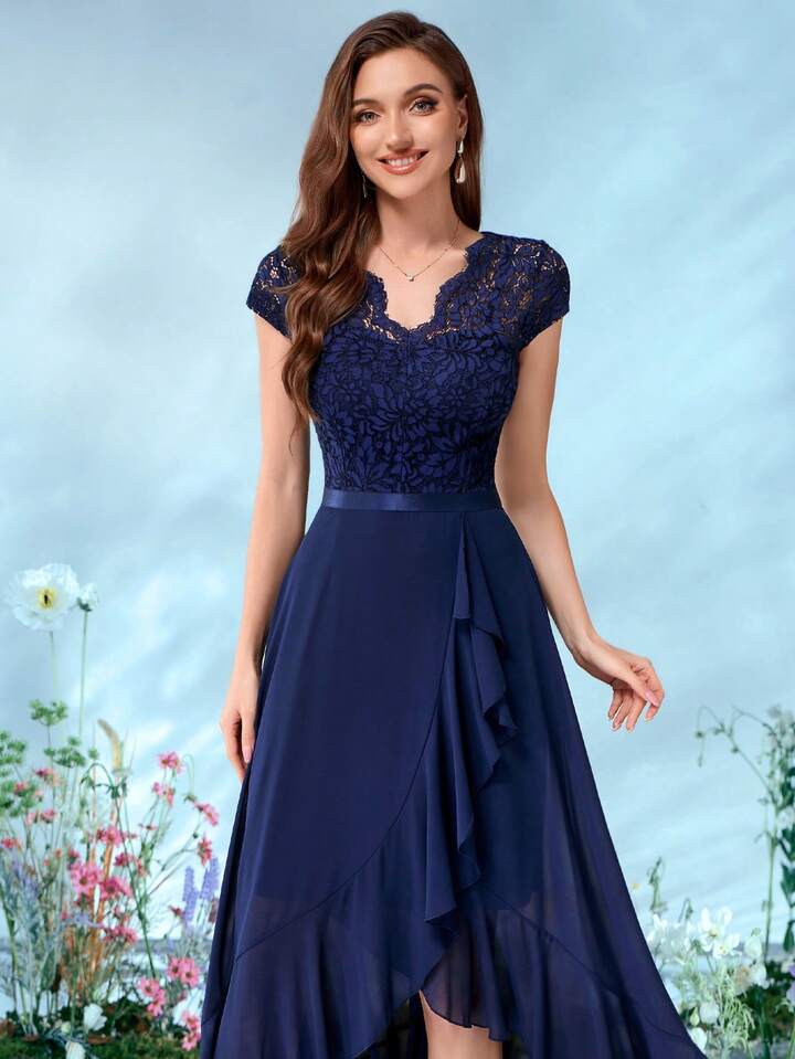 MIUSOL Abendkleid mit V-Ausschnitt, Blumen Spitze, Rüschen Saum und Chiffon für Partys
