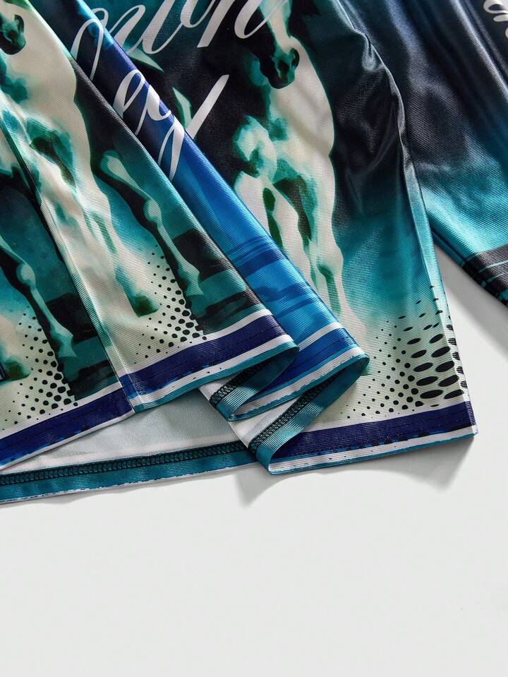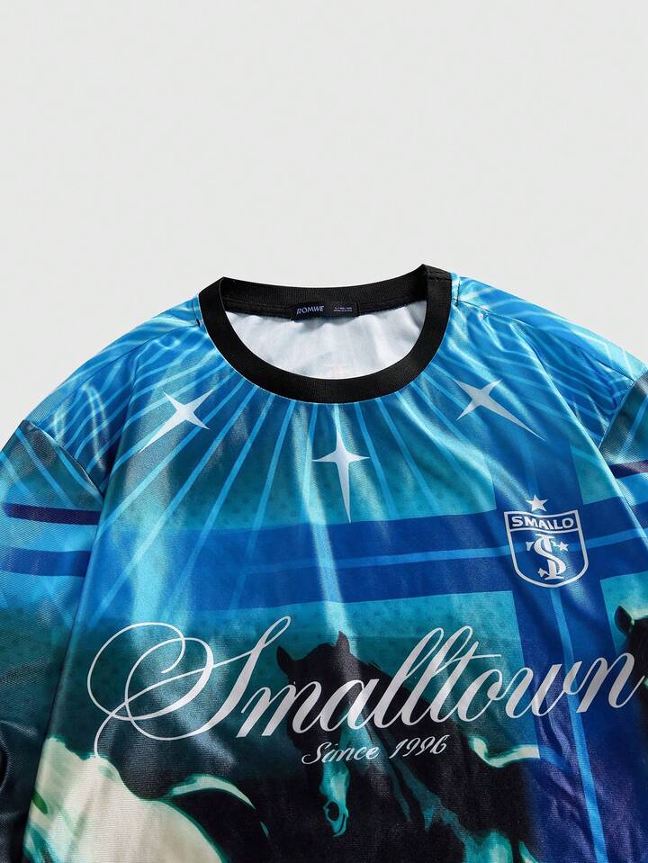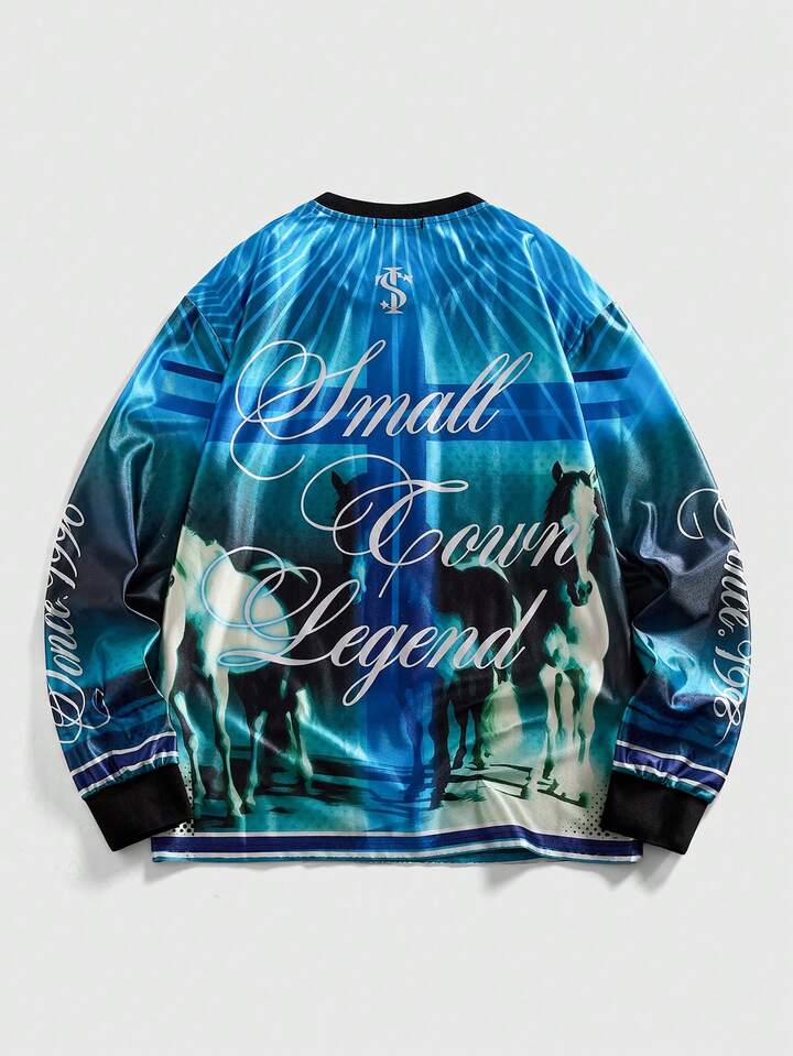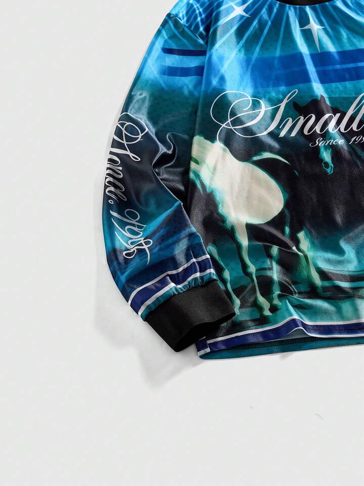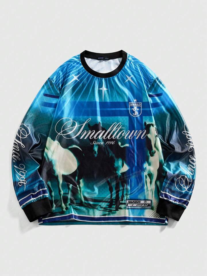 Herren Lässig College Stil Pferde Muster Rundhals Langarm T-Shirt, Herbst
