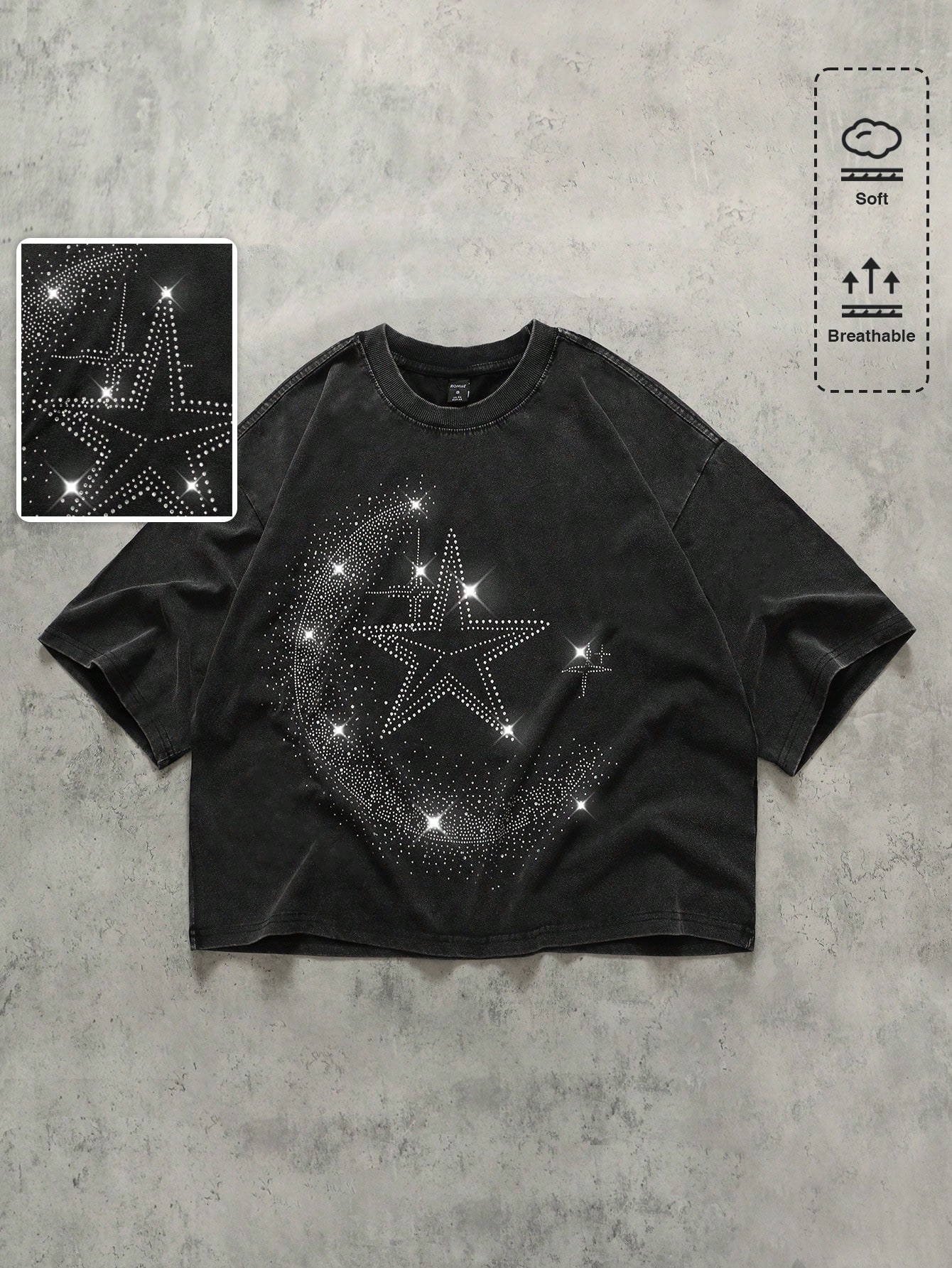 Herren Lässig Rundhals Kurzarm T-Shirt mit Strass Stern Muster