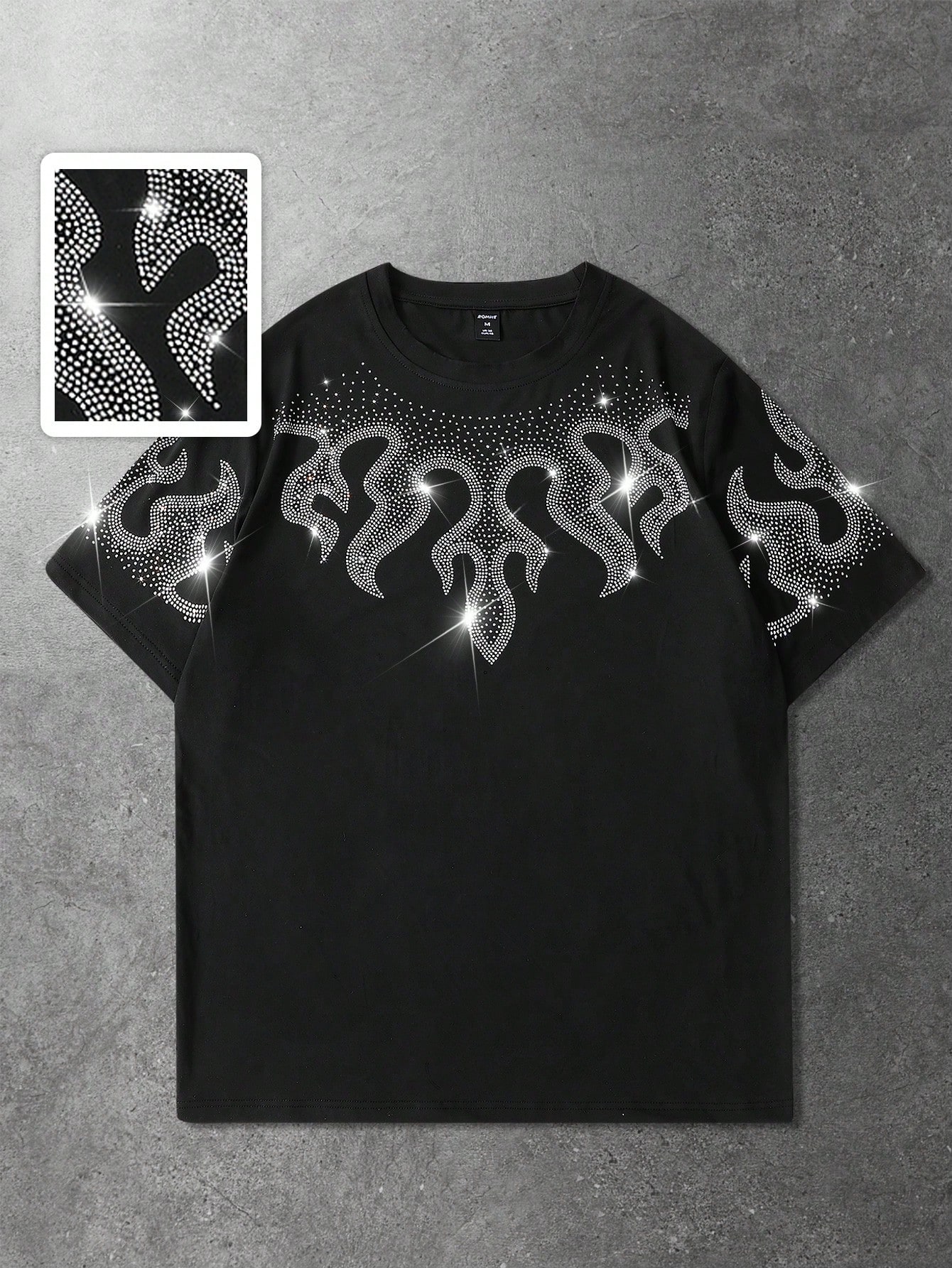 Herren Lässig Street Style T-Shirt mit Strass-Verzierung und Flammen-Muster, Kurzarm
