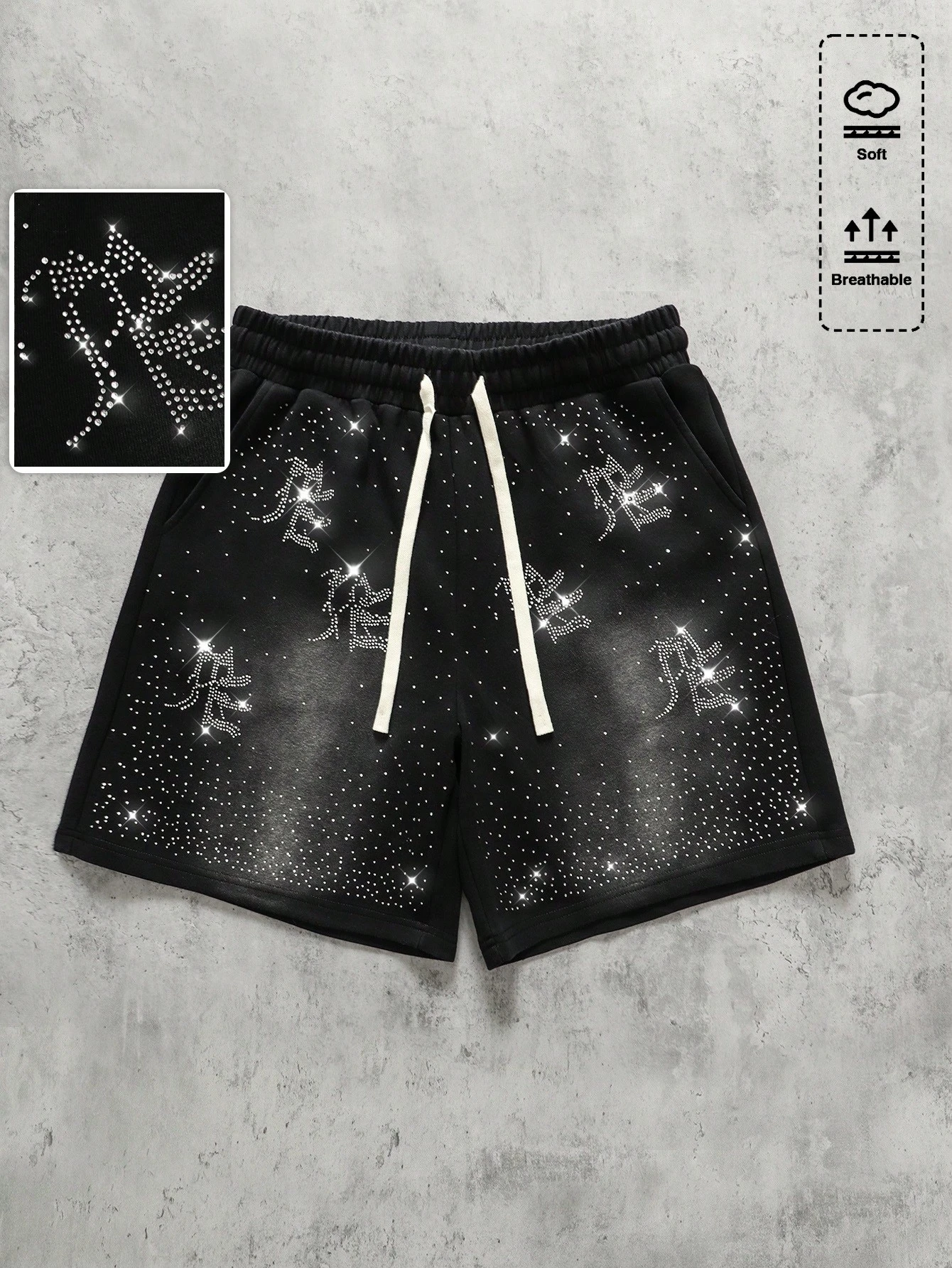 Herren Shorts mit Kordelzug in der Taille, Buchstaben- und Strass-Grafik, lässig und vielseitig für den täglichen Gebrauch