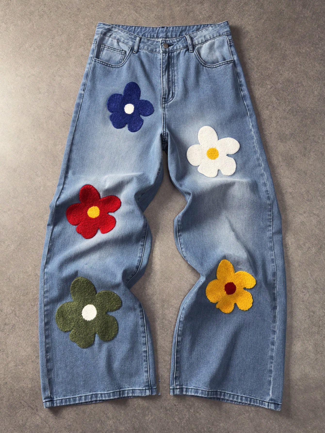 Herren Jeans mit weitem Bein, locker geschnitten, mit floraler Stickerei auf der Tasche