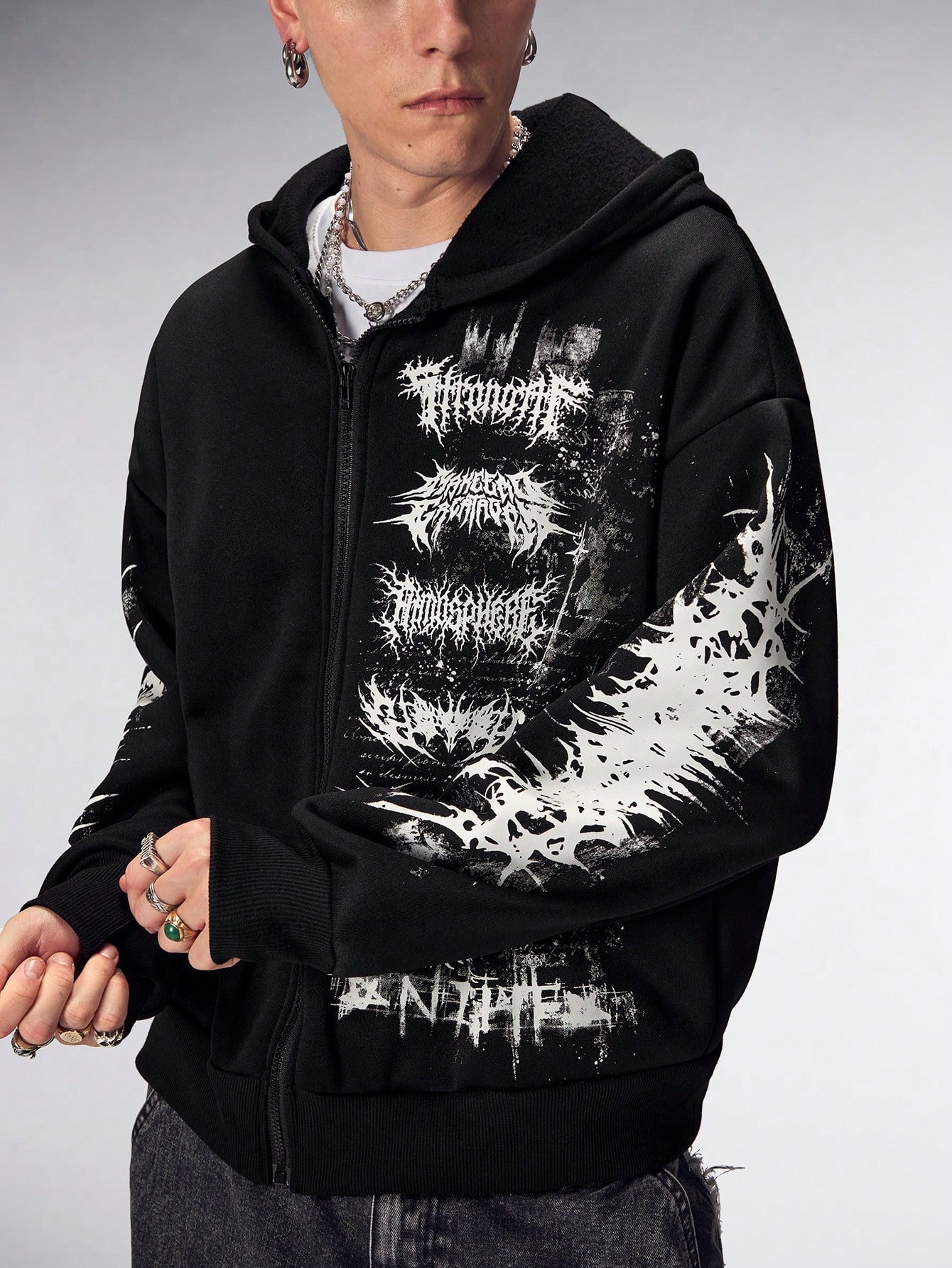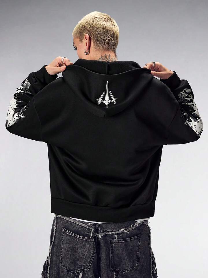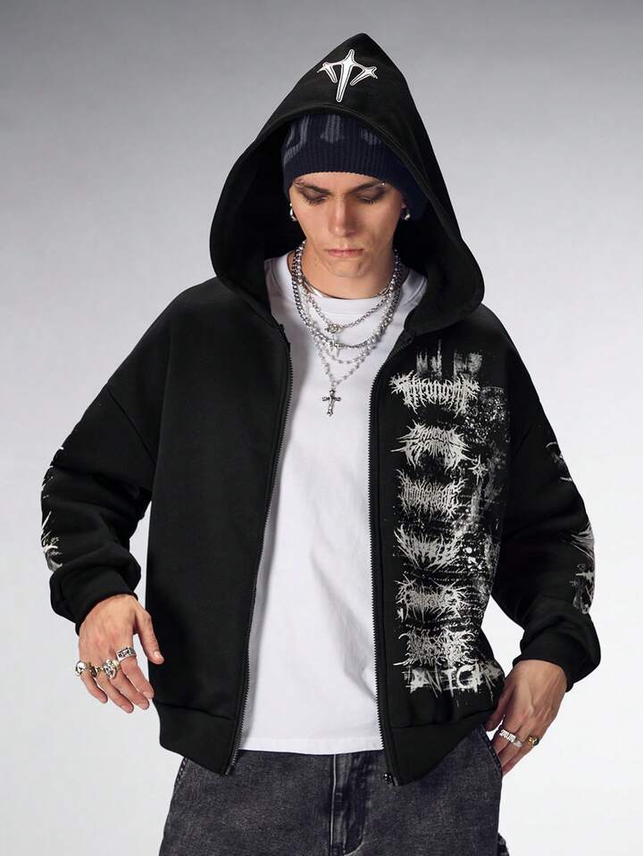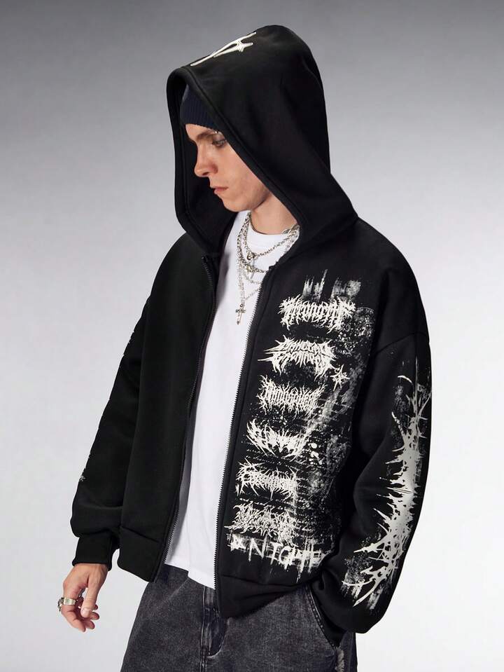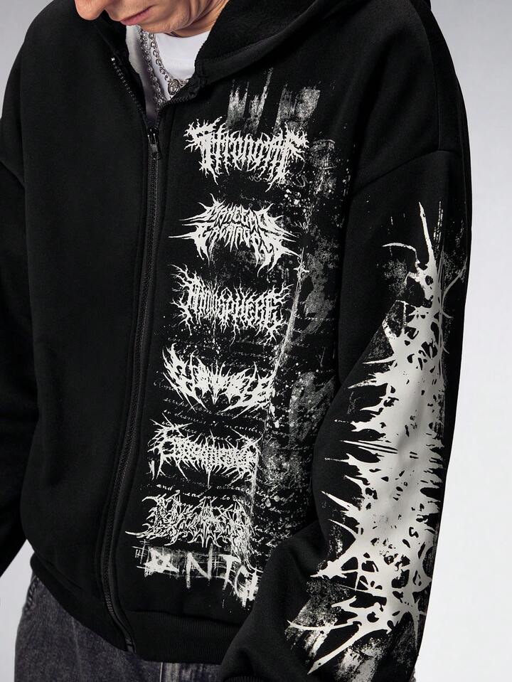 Herren Gothic Buchstaben Muster Reißverschluss Lässiger Loose Hoodie Sweatshirt