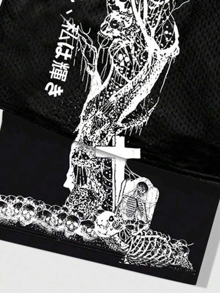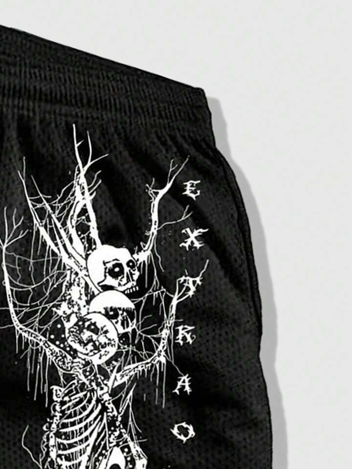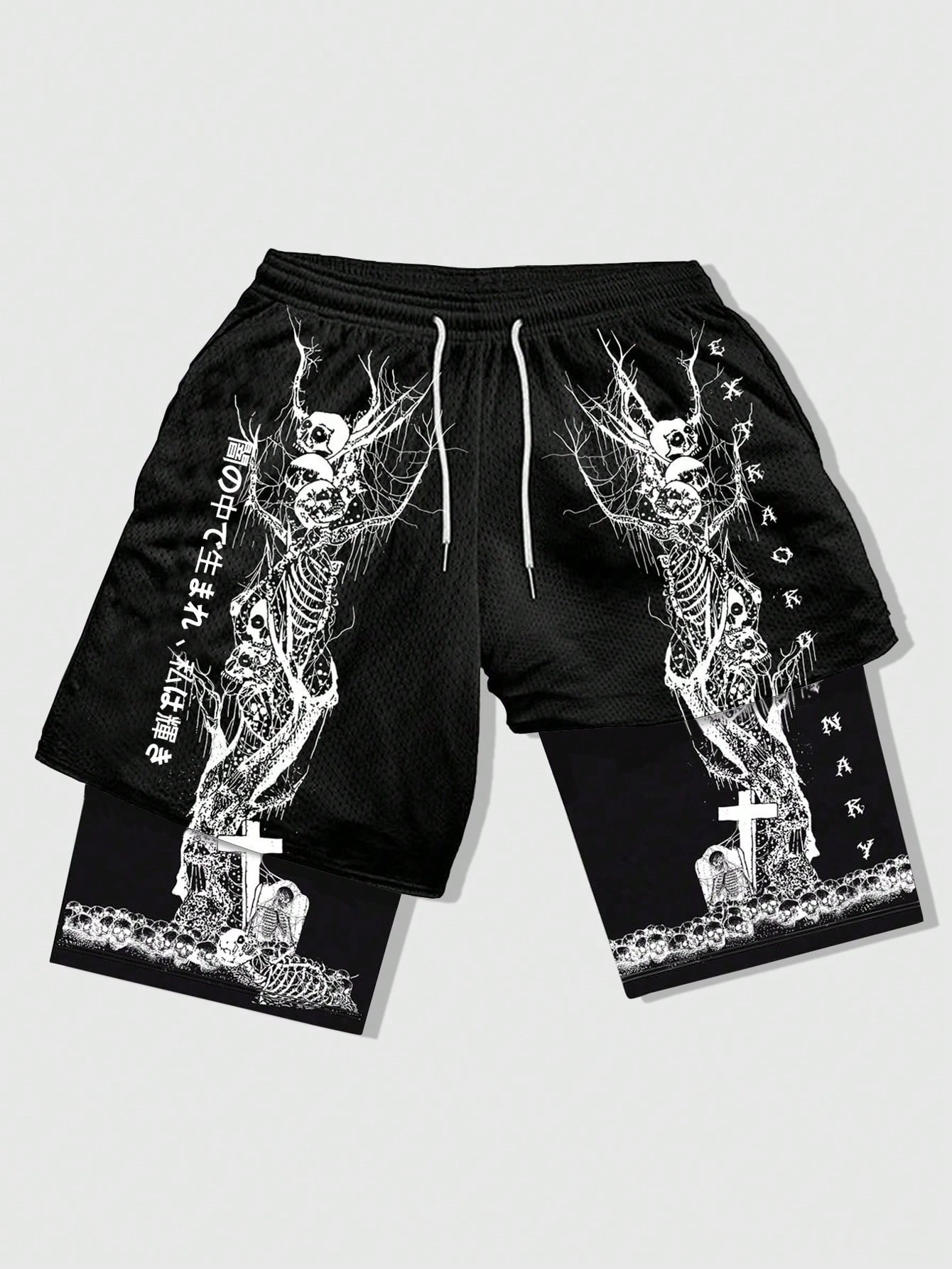 Herren Gothic Totenkopf Grafik Muster 2-in-1 Sport Shorts, Halloween