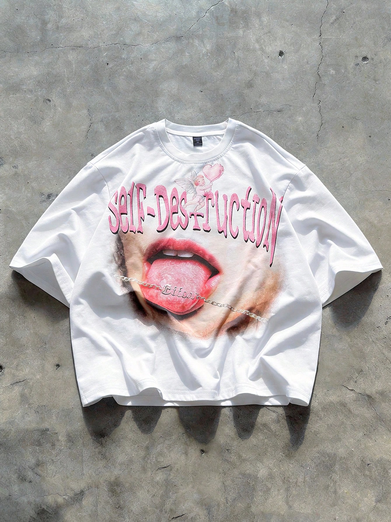 Herren Grafik Buchstaben Muster Kurzarm T-Shirt, Retro Straßen-Stil