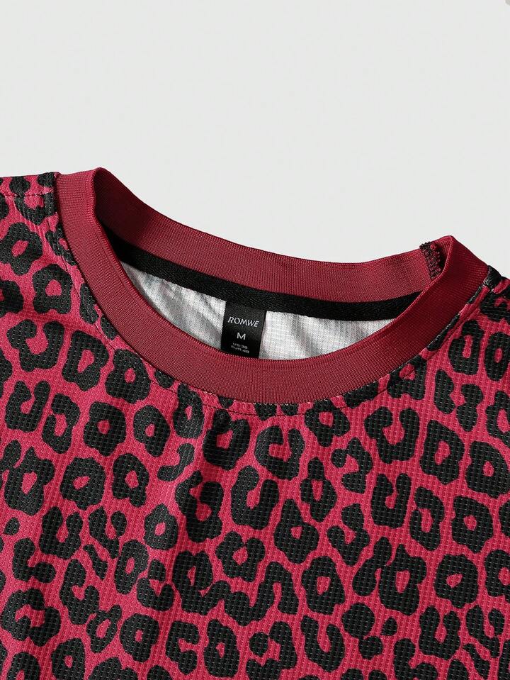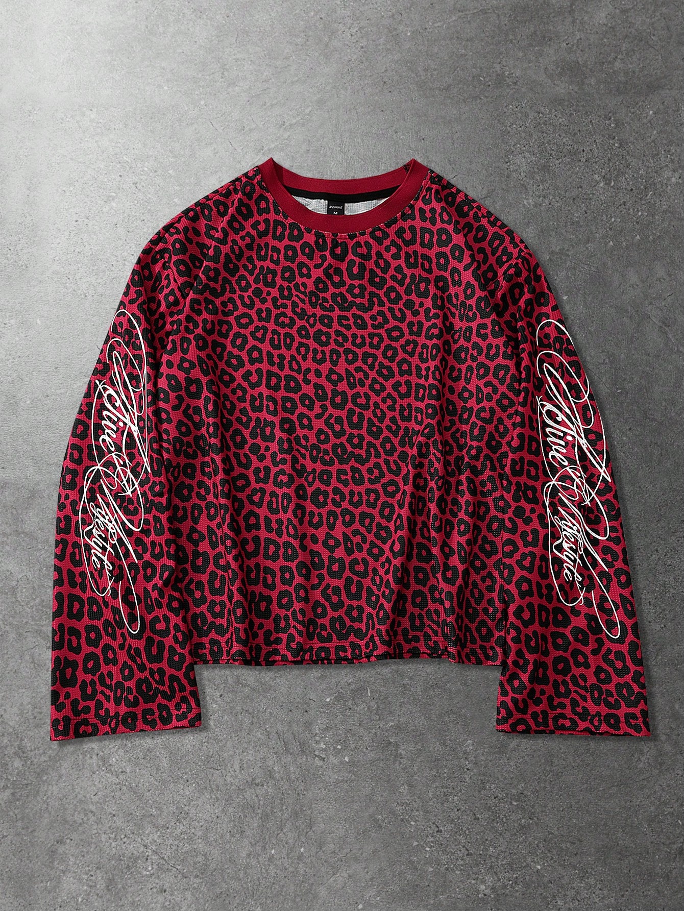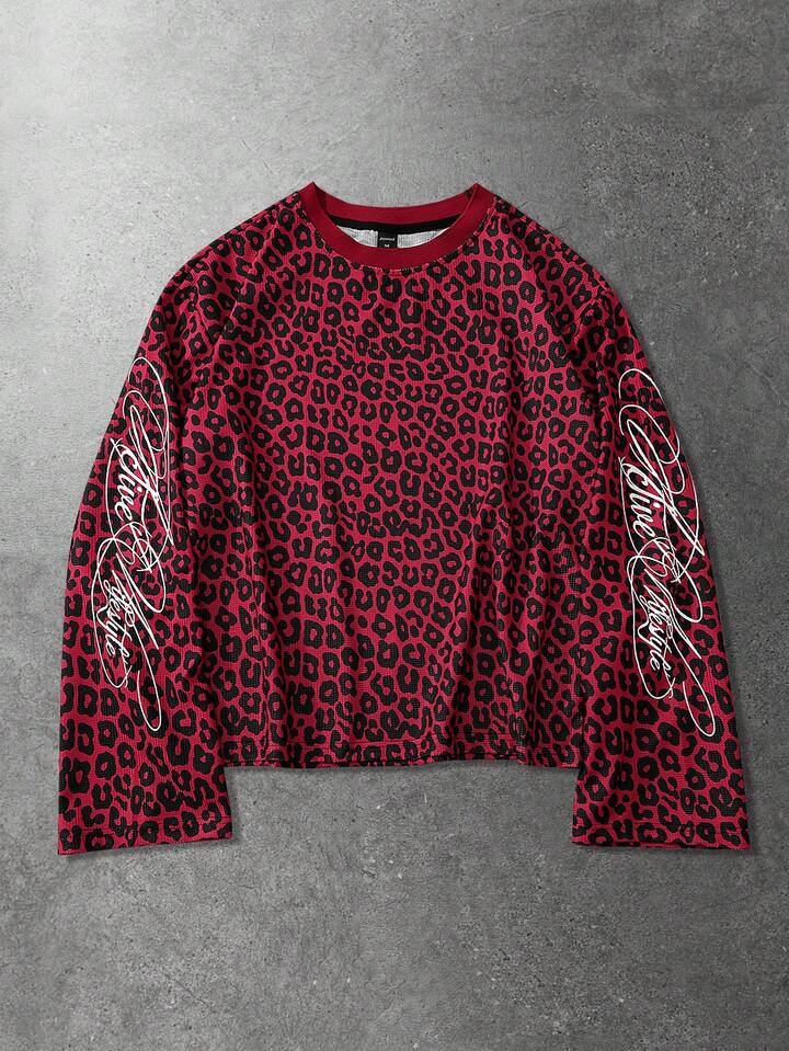 Herren Leoparden-Muster Textur Englisch Grafik Langarm T-Shirt, lässiger Streetwear-Stil