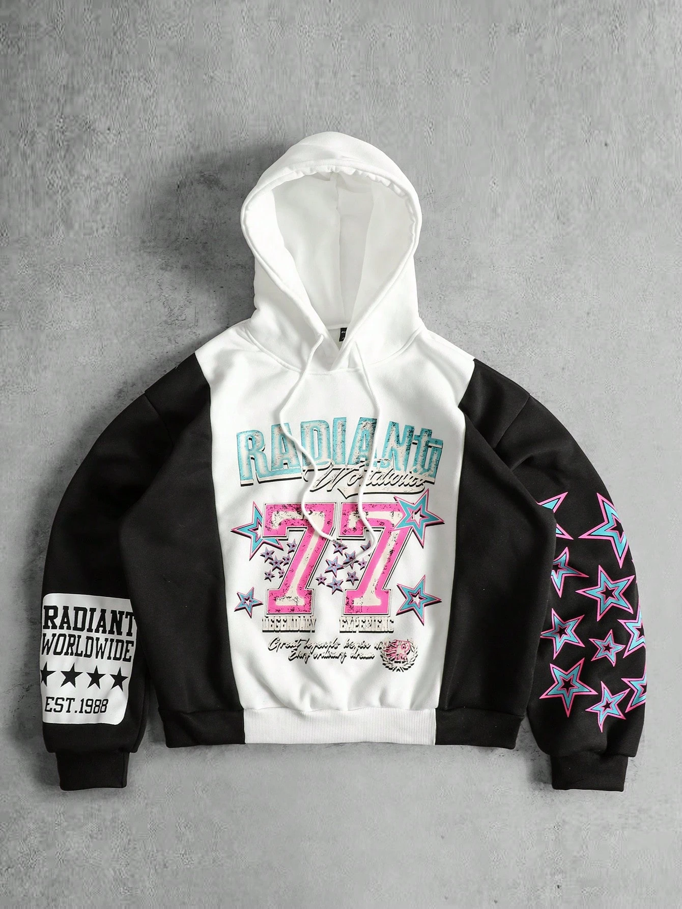 Herren Patchwork Kontrast Farbdruck Hoodie, Loose Fit