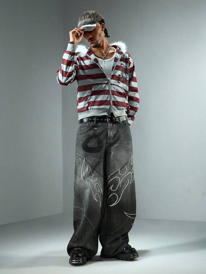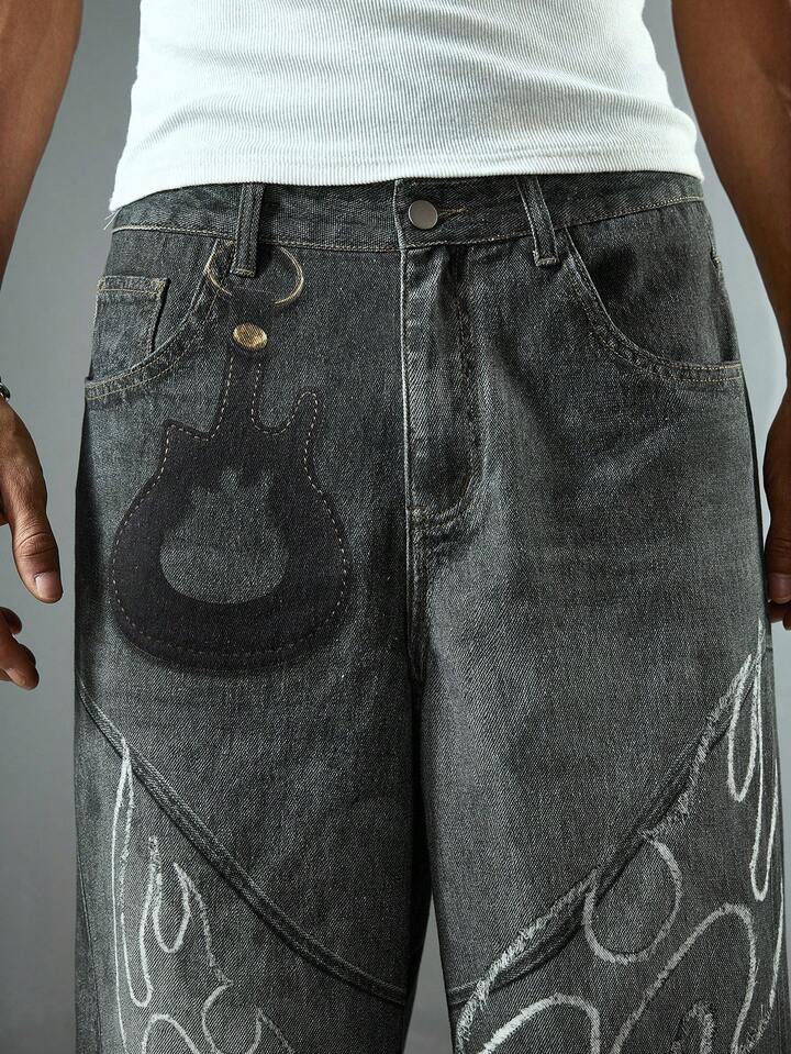 Herren Jeans mit Flammen-Muster, weite Passform mit Tasche und Knopfverschluss
