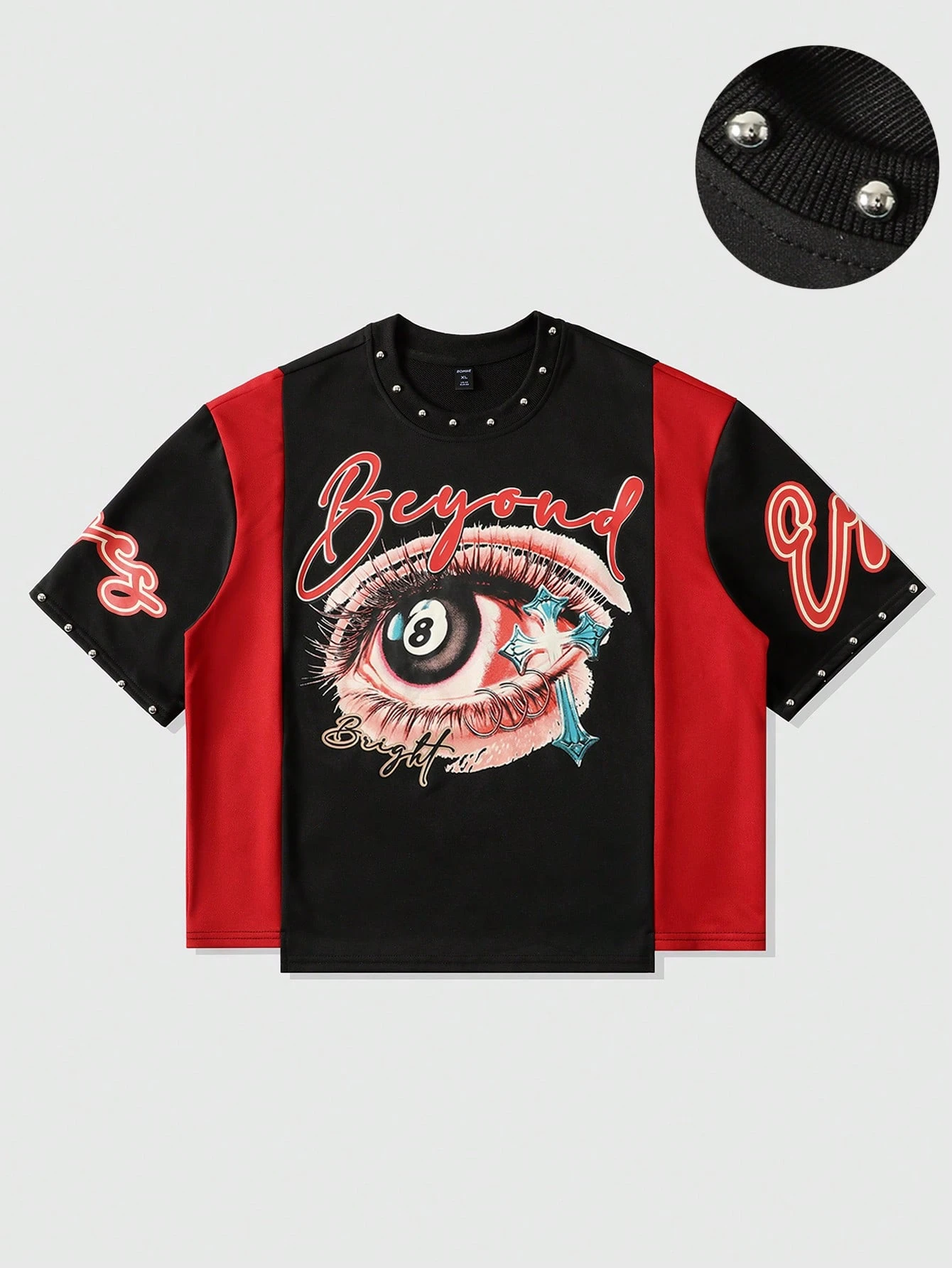 Street Life Herren Nieten Patchwork bedrucktes Kurzarm T-Shirt, locker geschnitten