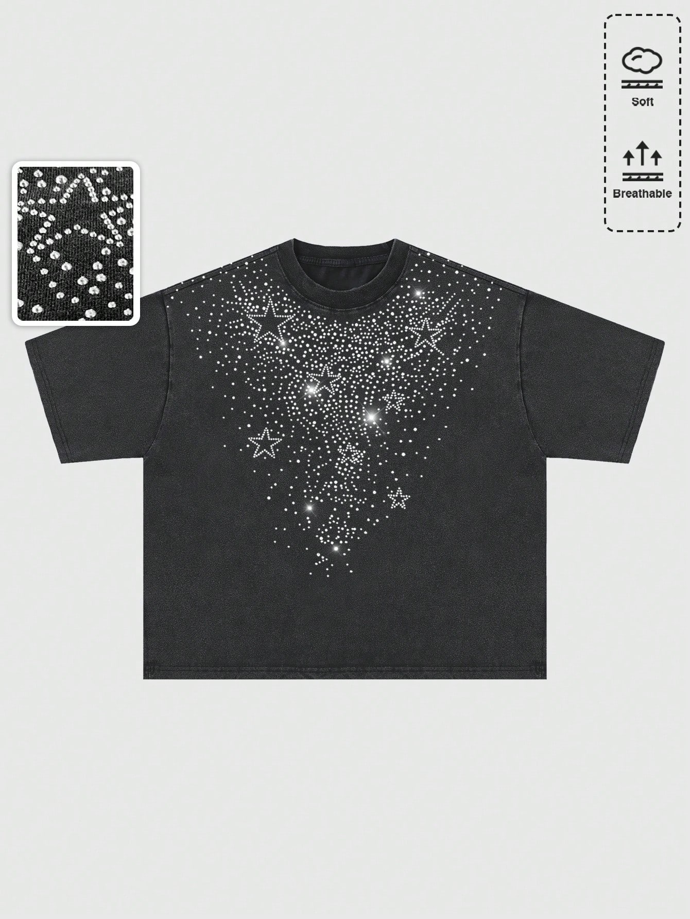 Herren Rundhals T-Shirt mit Strass-Fünfzackigem Stern Grafik, Lässig Alltag Verwaschen Kurzarm