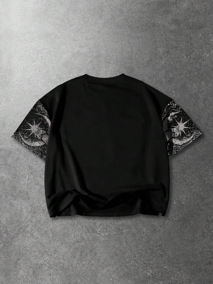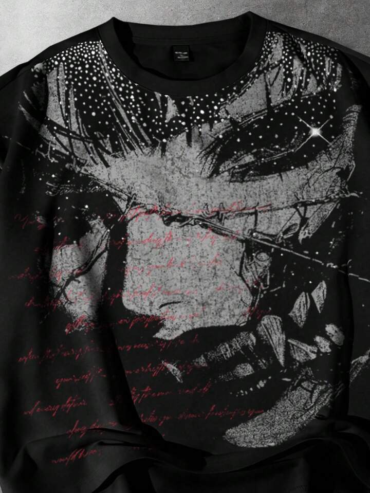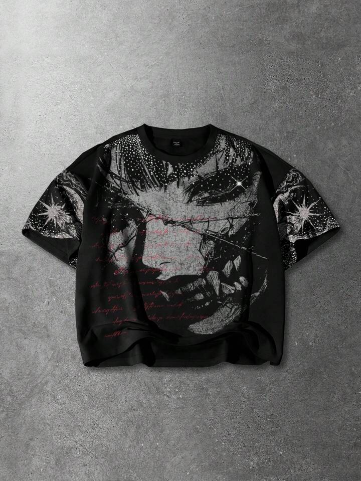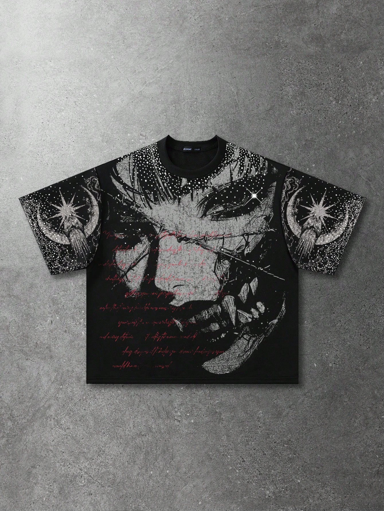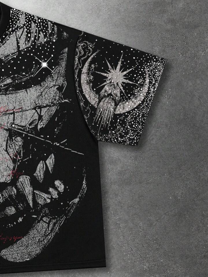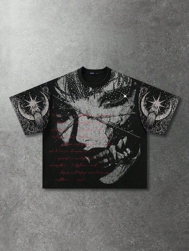 Herren Slogan- & Figuren Muster Rundhals Lässig Strass verziertes Kurzarm T-Shirt, locker geschnitten