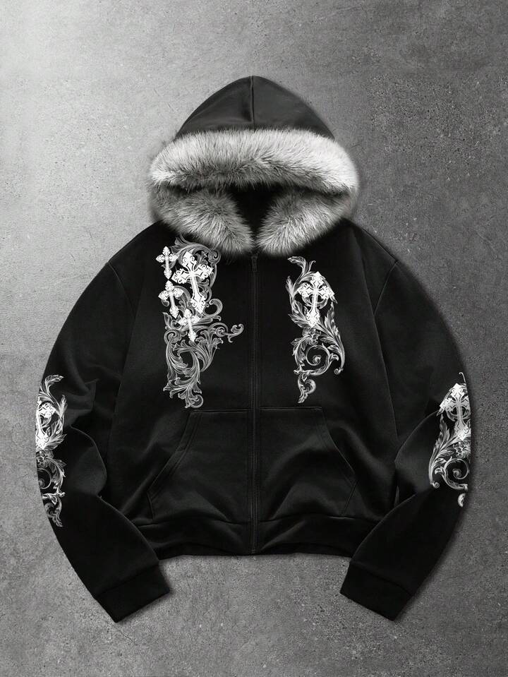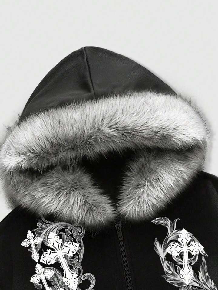 Herren Streetwear Kreuz-Muster Alltagskleidung Reißverschluss-Kapuzenpullover mit Fellkragen
