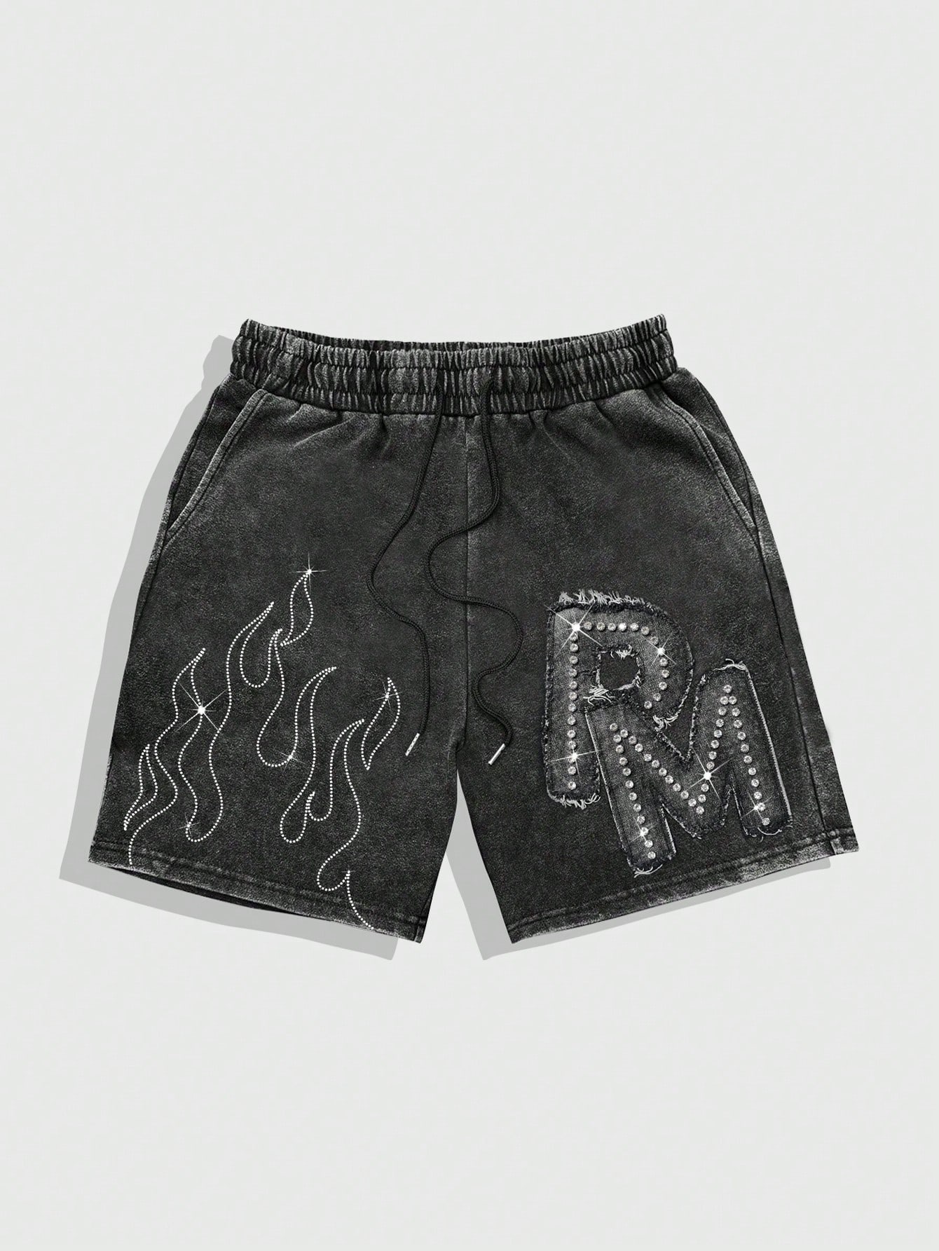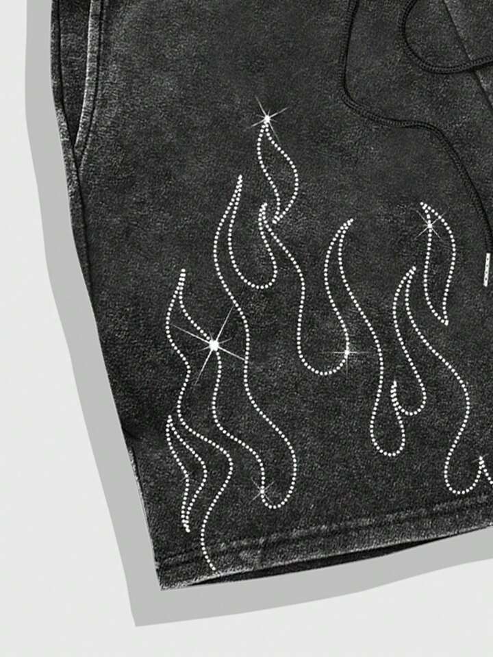 Street Life Herren Shorts mit Kordelzug Taille, Taschen und Flammen Muster mit Strass