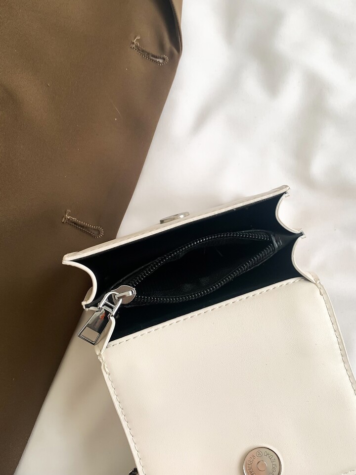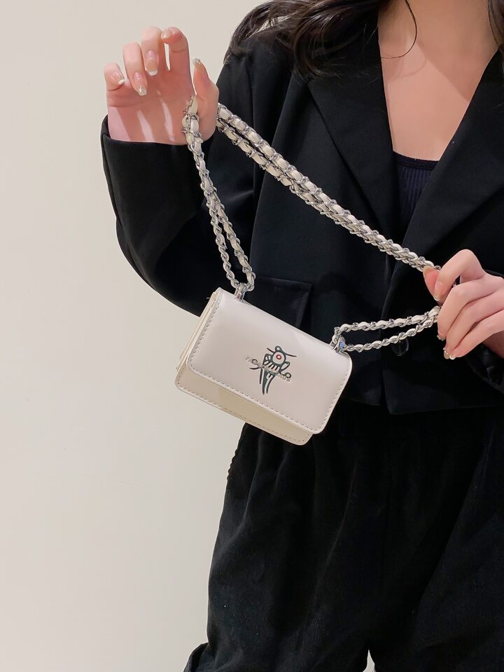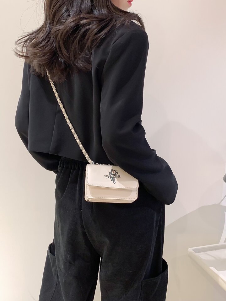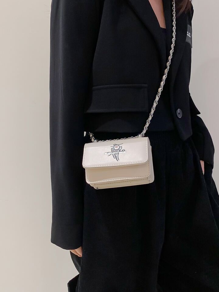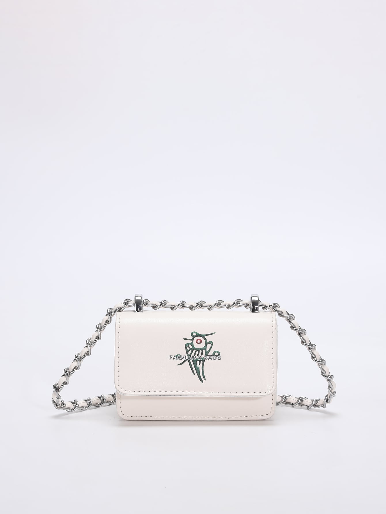 Quadratische Tasche mit Mini Vogel & Buchstaben Grafik, Kette, Klappe