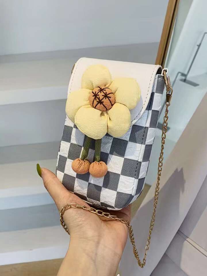 Quadratische Tasche mit Mini Karo Muster, Blume Dekor, Kette, Klappe