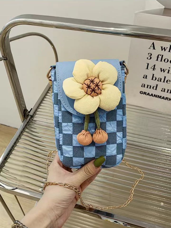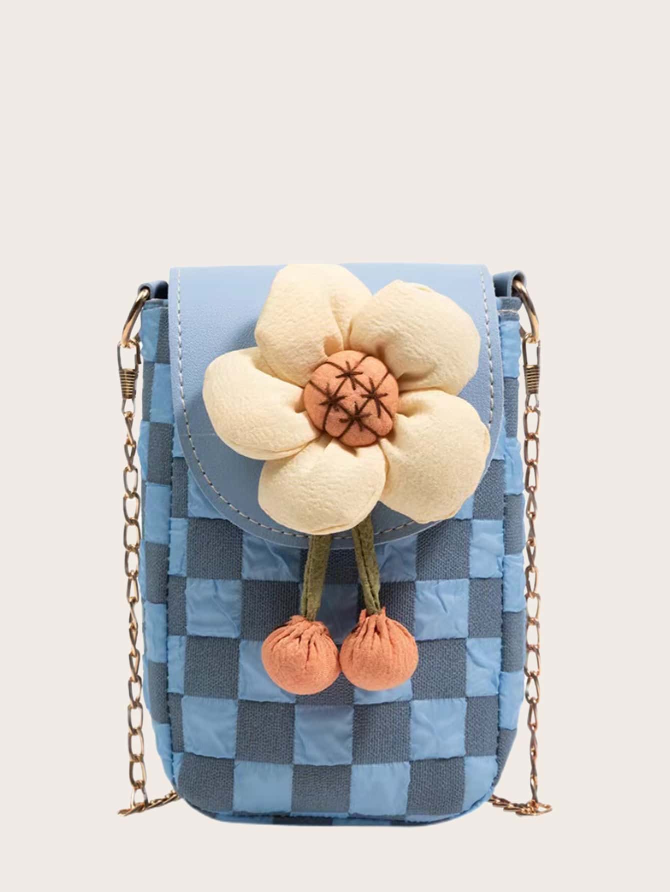 Quadratische Tasche mit Mini Karo Muster, Blume Dekor, Kette, Klappe